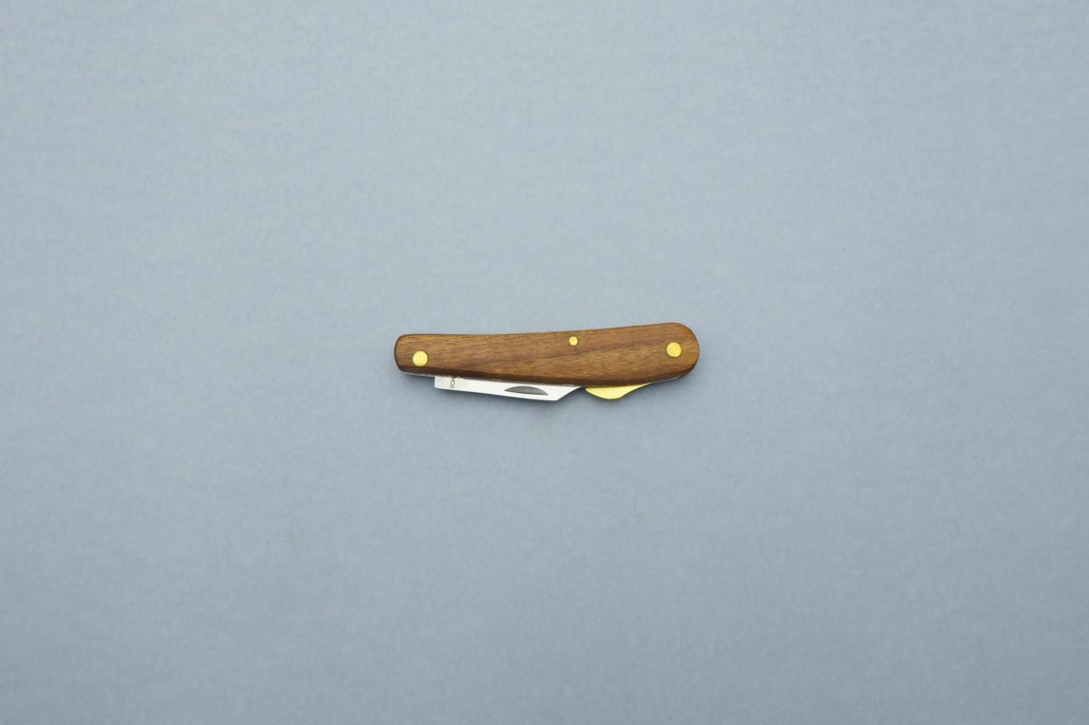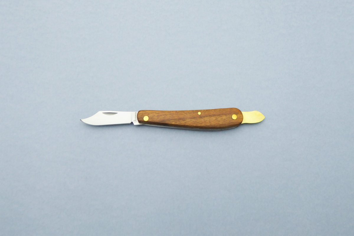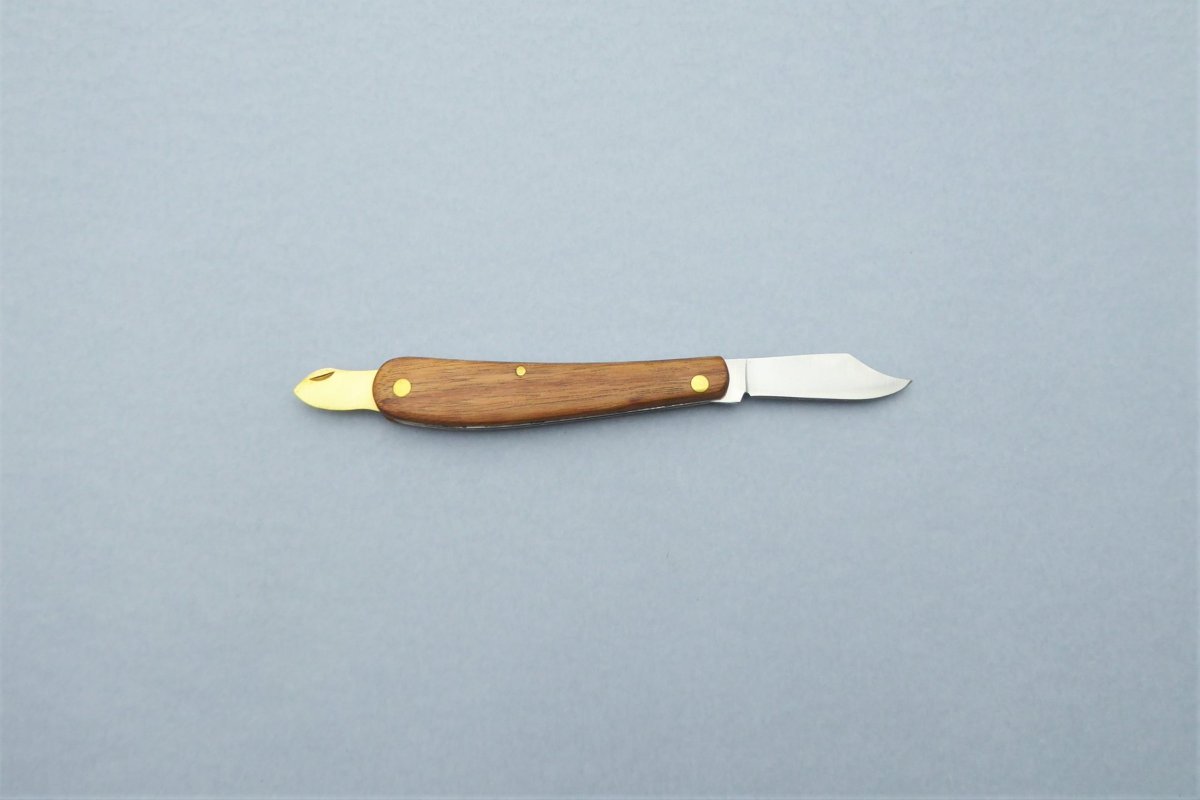 Descripción: Navaja de injertar con puño de madera y hoja de acero inoxidable, con uña para su fácil extracción. Bloqueo de pistón. Incluye púa plegable de 2,7 cm.
