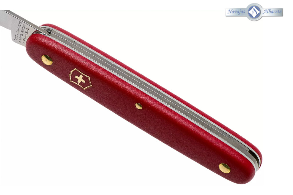 Descripción: Navaja para injertar Victorinox con dos funciones. Mango de poliamida color rojo. Hoja de acero inoxidable y separador de corteza de latón. Herramienta de jardinería práctica y ligera ideal para los amantes de la jardinería y las flores.