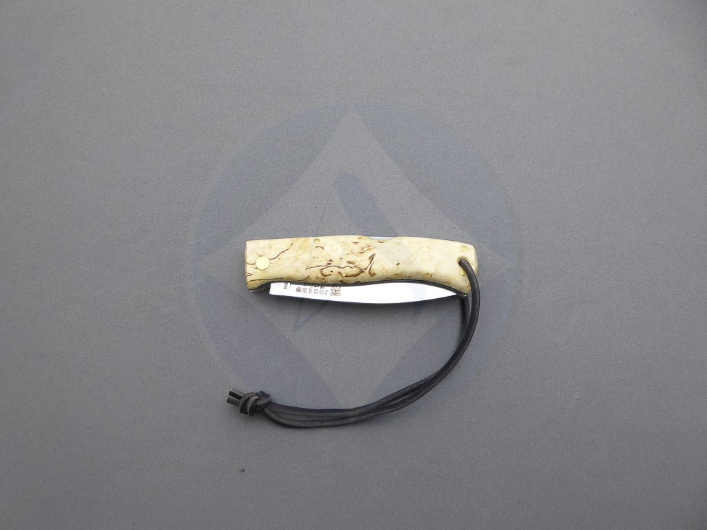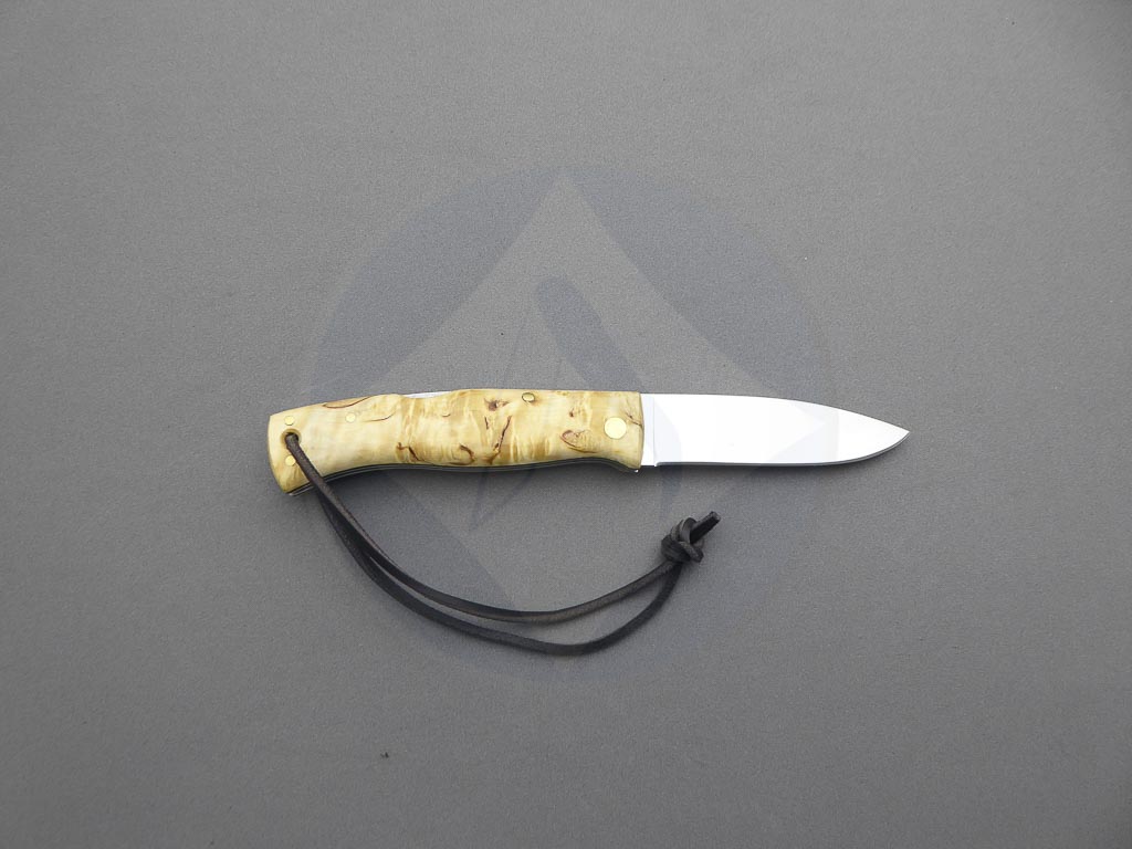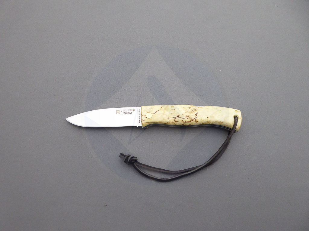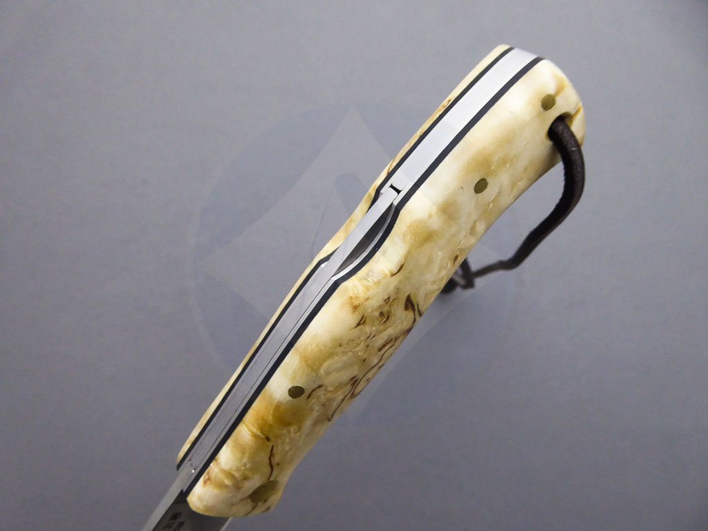 Descripción: Navaja Bushcraft «Artíca» con mango de madera de abedul rizado con separador negro. Hoja de acero Sandvik con filo plano y acabado satinado, de gran resistencia y durabilidad. Cordón de piel en el pomo. Bloqueo de seguridad backlock. Hecha a mano en Albacete. Ideal para actividades al aire libre, caza o uso diario. También disponible en otros acabados: olivo, nogal y jute micarta.