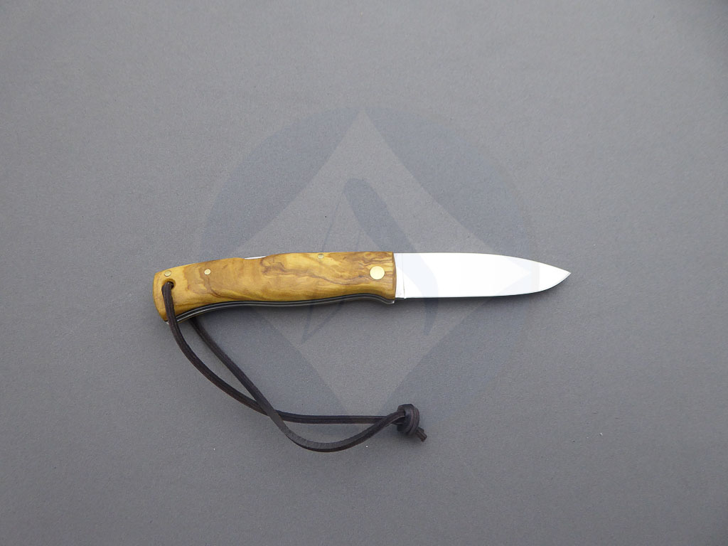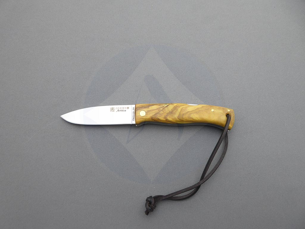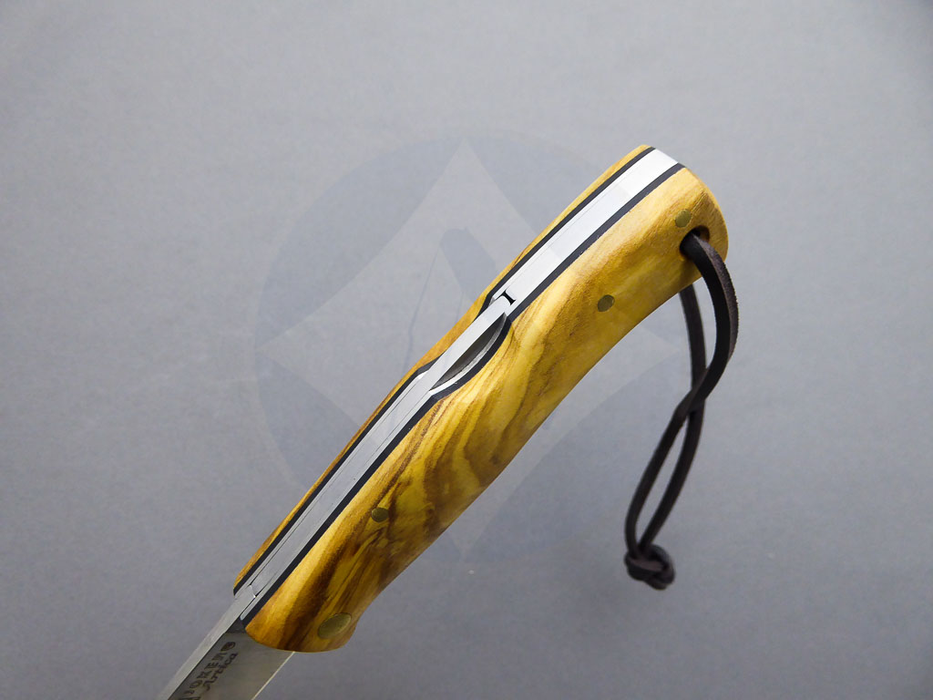 Descripción: Navaja Bushcraft «Artíca» con mango de madera de olivo con separador negro. Hoja de acero Sandvik con filo plano y acabado satinado, de gran resistencia y durabilidad. Cordón de piel en el pomo. Bloqueo de seguridad backlock. Hecha a mano en Albacete. Ideal para actividades al aire libre, caza o uso diario. También disponible en otros acabados: nogal, abedul y jute micarta