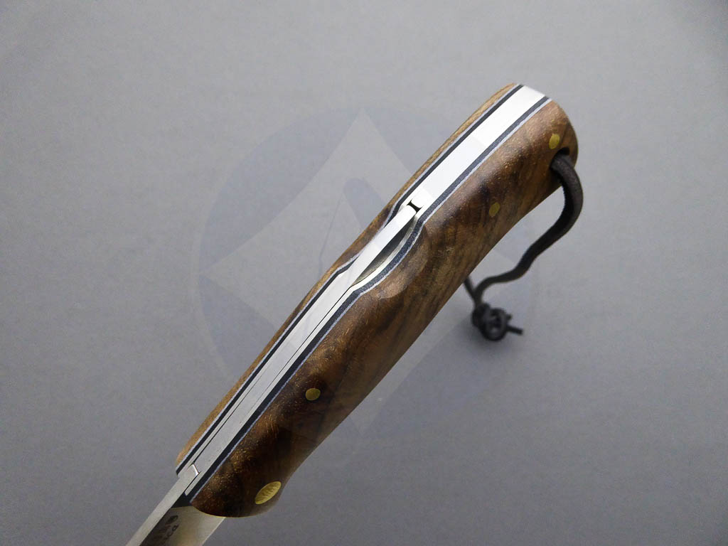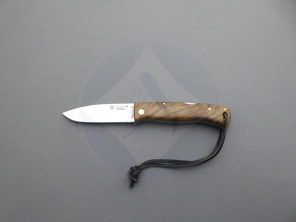 Descripción: Navaja Bushcraft «Artica» con mango de madera de nogal con separadores negro y blanco. Hoja de acero Sandvik con filo plano y acabado satinado, de gran resistencia y durabilidad. Cordón de piel en el pomo. Bloqueo de seguridad backlock. Hecha a mano en Albacete. Ideal para actividades al aire libre, caza o uso diario. También disponible en otros acabados: olivo, abedul y jute micarta.