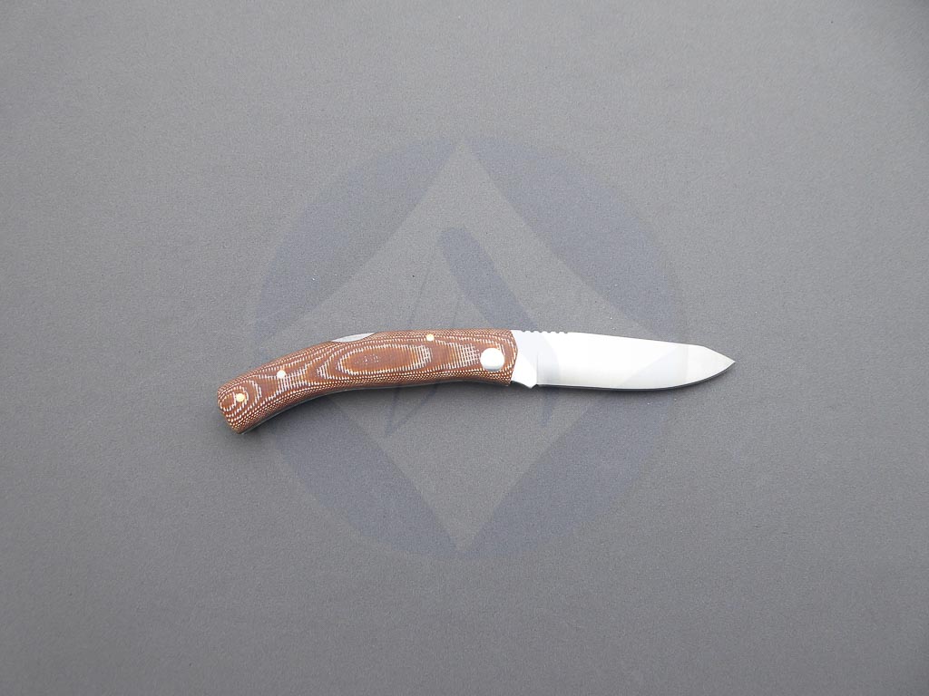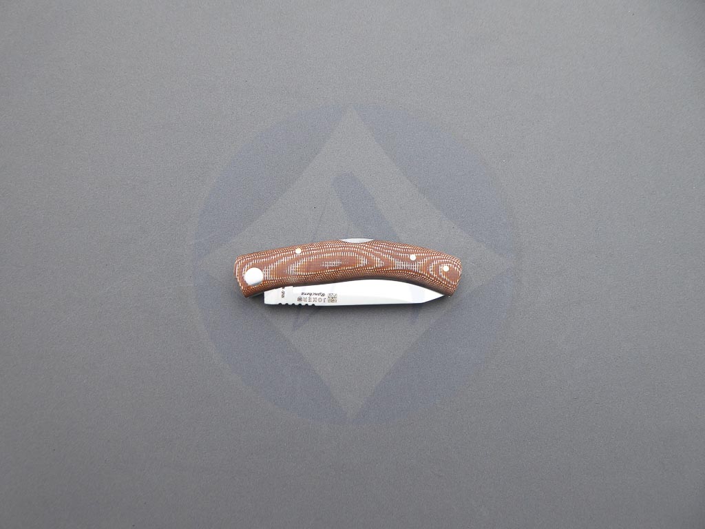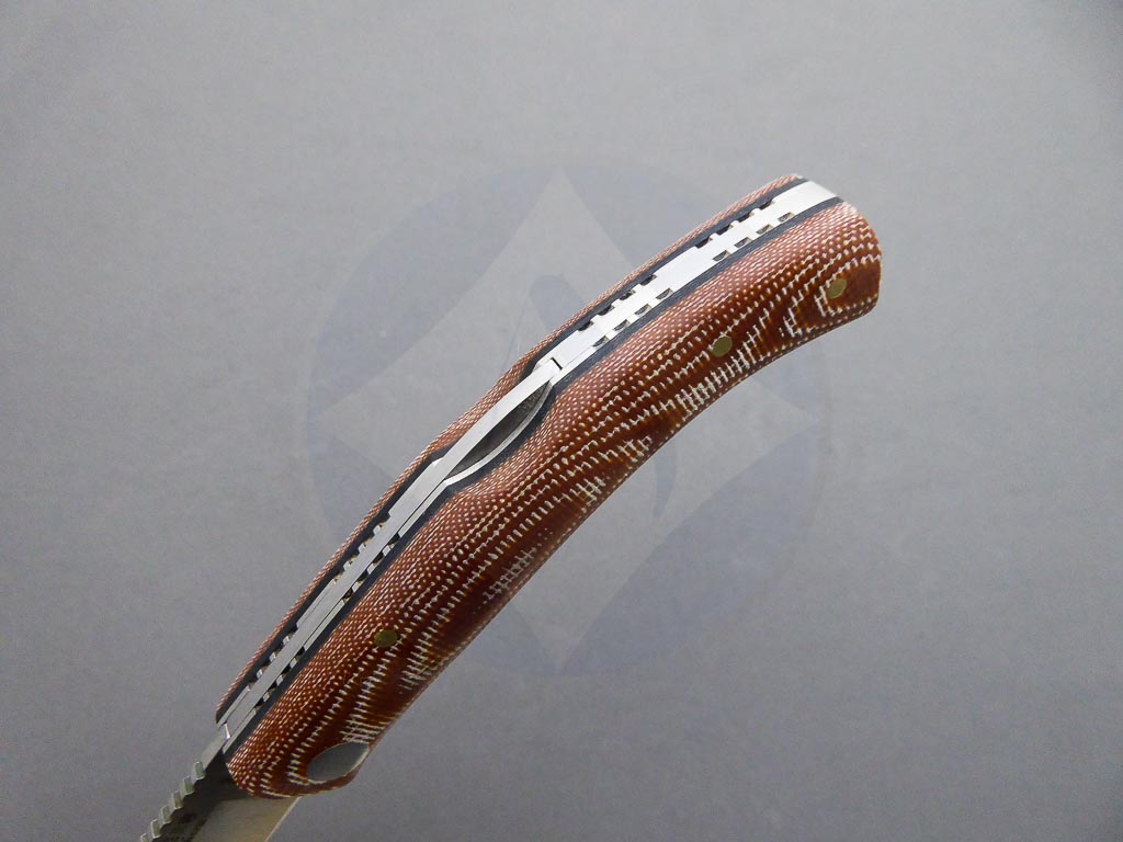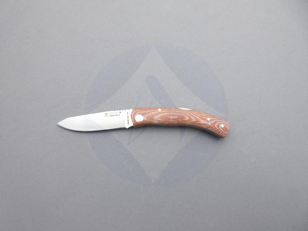 Descripción: Navaja deportiva «Ranchera» con mango de micarta Canvas con separador negro. Hoja de acero inoxidable de gran resistencia y durabilidad. Bloqueo de seguridad back lock. Hecha a mano en Albacete. Ideal para actividades al aire libre, caza o uso diario.