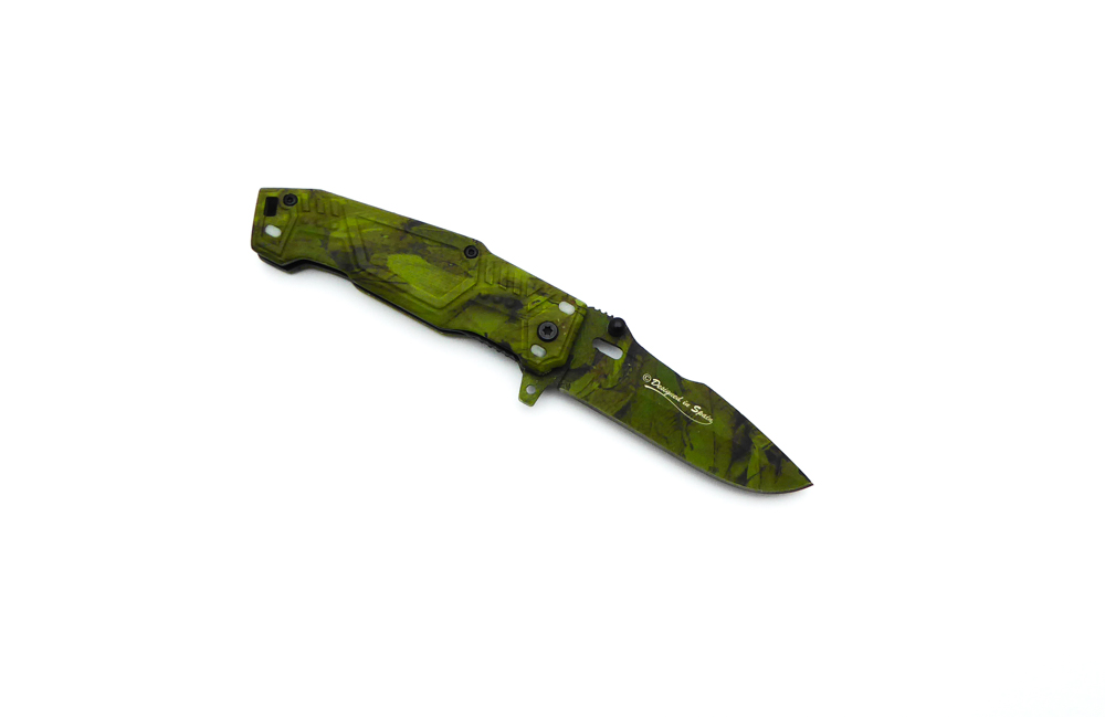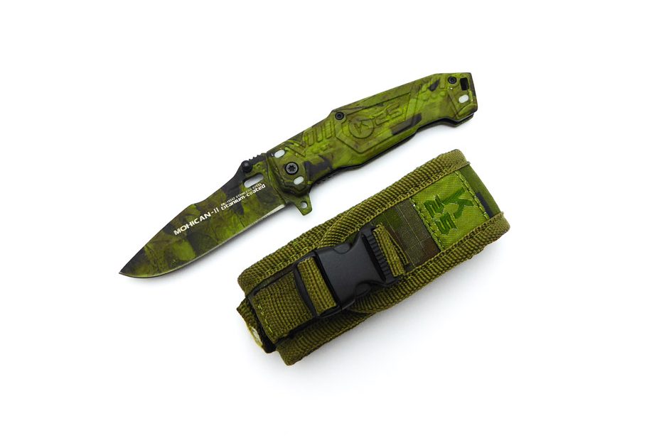 Descripción: Navaja táctica K25 «Mohican» con mango de aluminio engomado antideslizante, color camuflaje verde, con inserciones visibles en la oscuridad. Hoja de acero inoxidable con recubrimiento de titanio. Incluye funda de nailon «camo verde», con velcro, clip de seguridad y sistema molle (sistema óptimo de enganches). Diseñada en España.