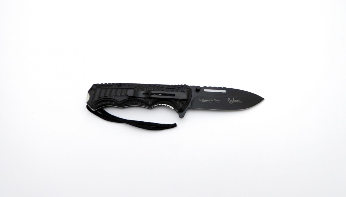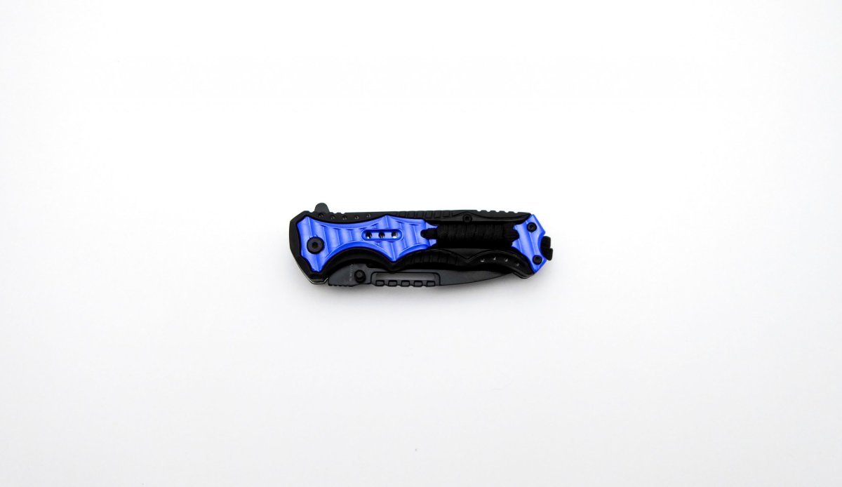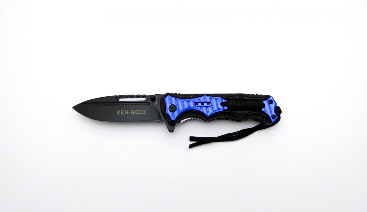 Descripción: Navaja táctica KEH-BECK con mango de aluminio y plástico ABS, negro y azul, con encordado negro. Hoja de acero inoxidable molibdeno vanadio calada acabado negro. Clip porta cinturón, sistema de seguridad Liner lock. Diseñada en España.