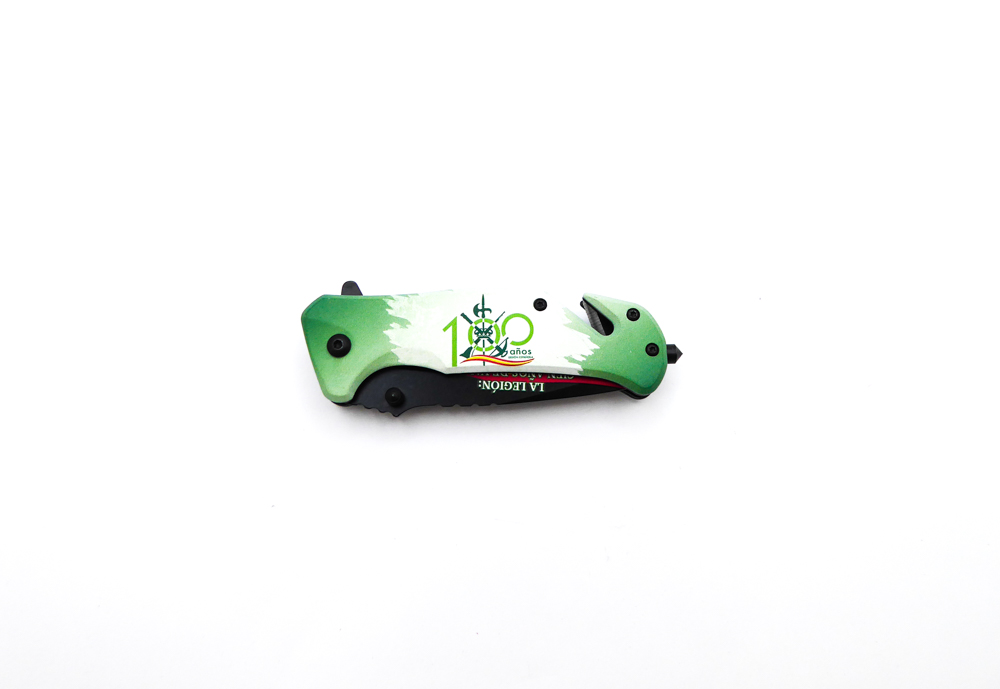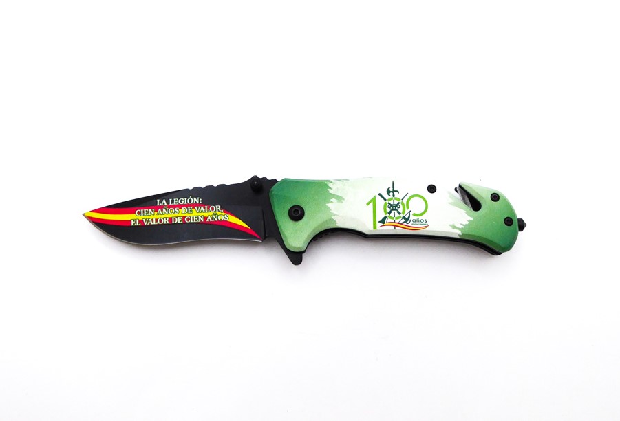 Descripción: Navaja táctica «Legión 100 años» con mango en aluminio con impresión efecto 3D. Hoja en acero molibdeno vanadio color negro, con impresión escrita «La legión: cien años de valor, el valor de cien años». Punta rompecristales, clip porta cinturón, bloqueo de seguridad Liner lock y cúter corta cinturón de una cuchilla. Diseñada en España.
