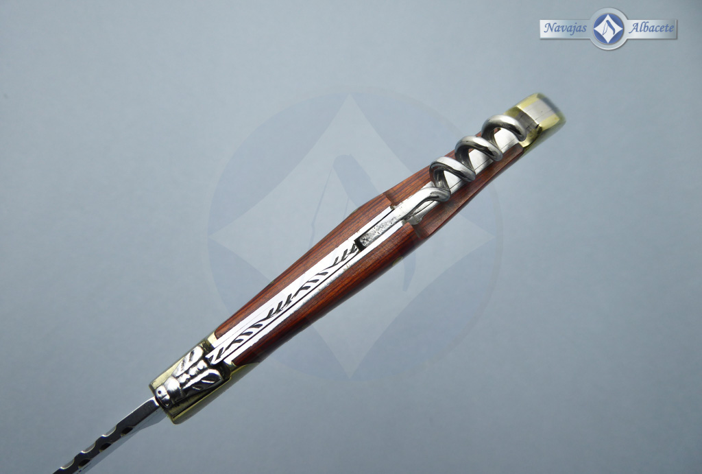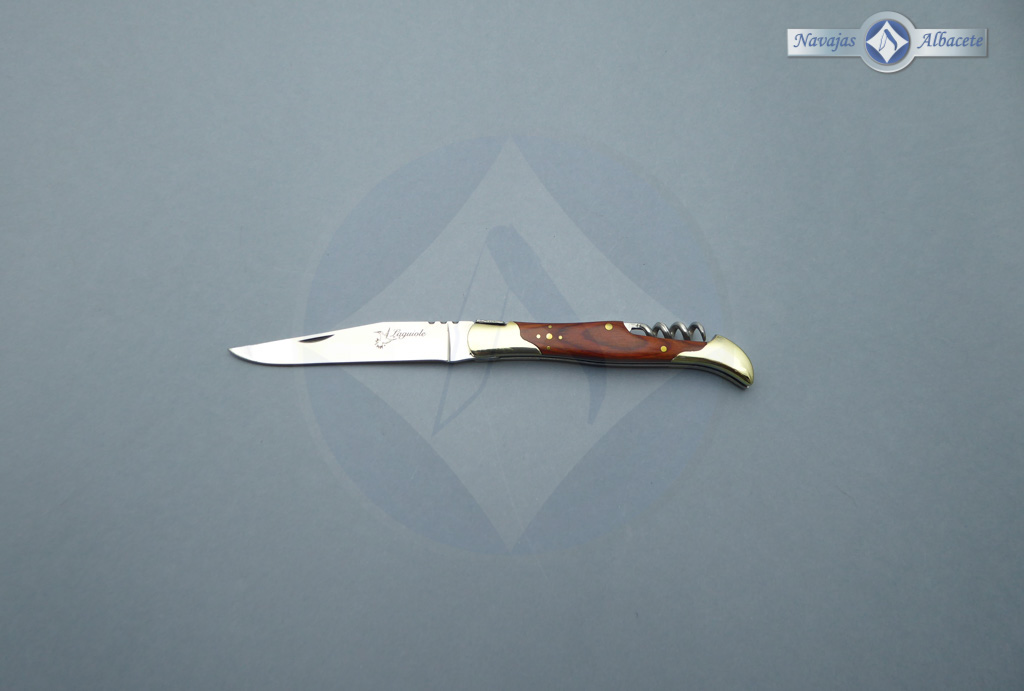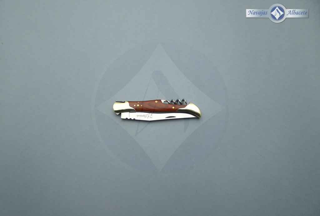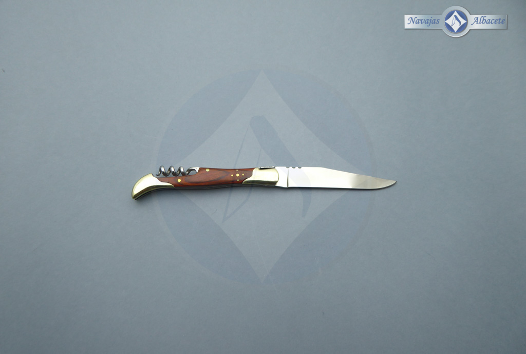 Descripción: Navaja Laguiole Luxury con mango de madera stamina roja, virola y rebajo en alpaca dorada. Hoja de acero inoxidable acabado espejo, con uña. Bloqueo de pistón decorado. Diseñada en España. Incluye sacacorchos.