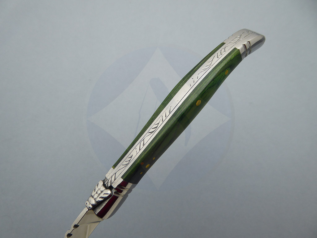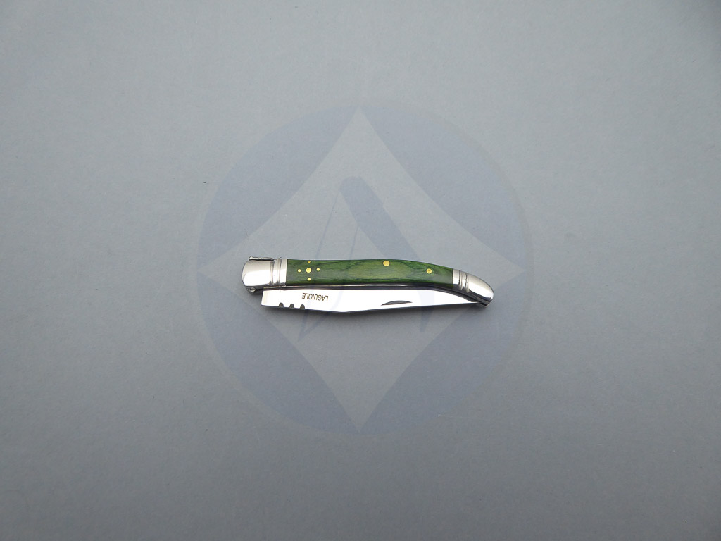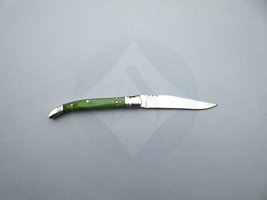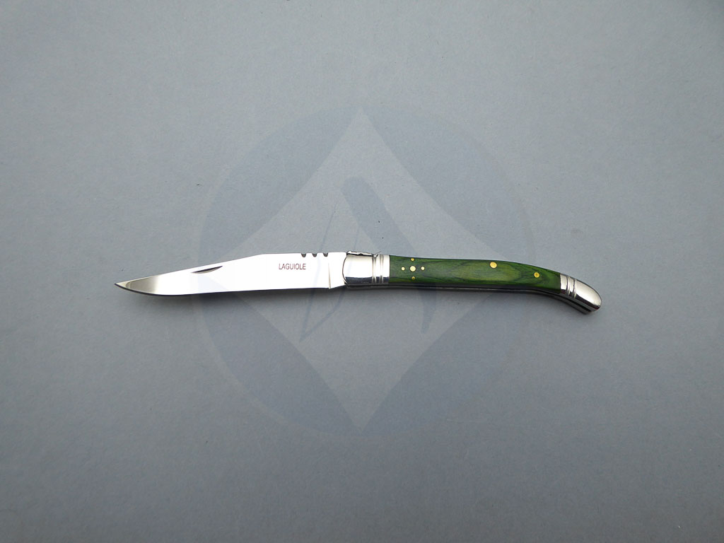 Descripción: Navaja Laguiole con mango de madera stamina color verde, virola y rebajo en acero. Hoja de acero inoxidable molibdeno vanadio, con uña para su fácil extracción. Cierre de pistón. Disponible en 2 tamaños de hoja, seleccione la opción que desee.