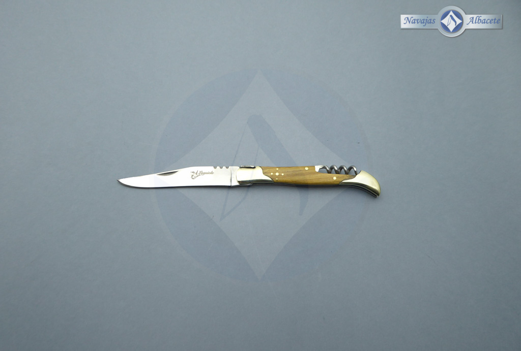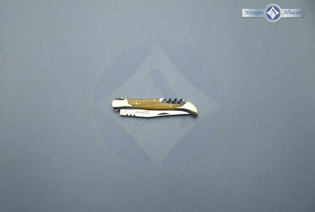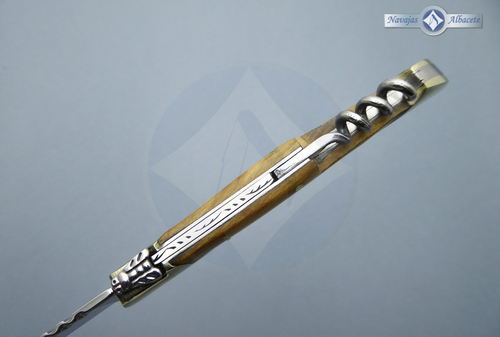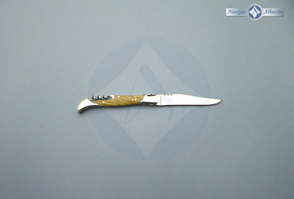 Descripción: Navaja Luxury Laguiole con mango de madera de olivo, virola y rebajo en alpaca dorada. Hoja de acero inoxidable acabado espejo, con uña. Bloqueo de pistón decorado. Diseñada en España. Incluye sacacorchos.