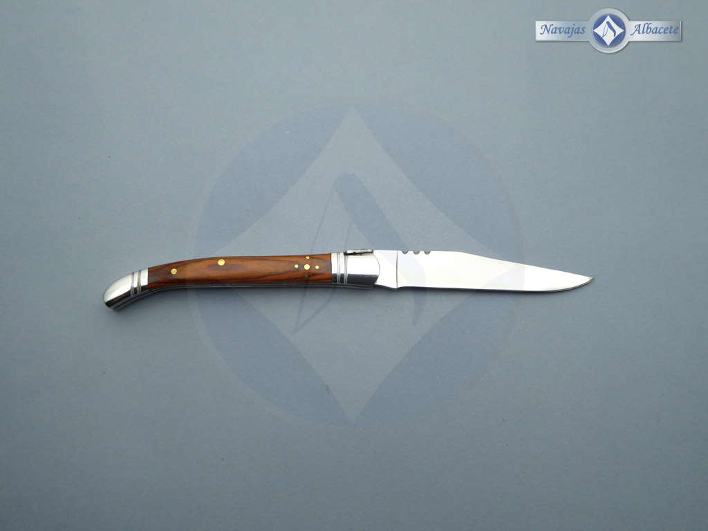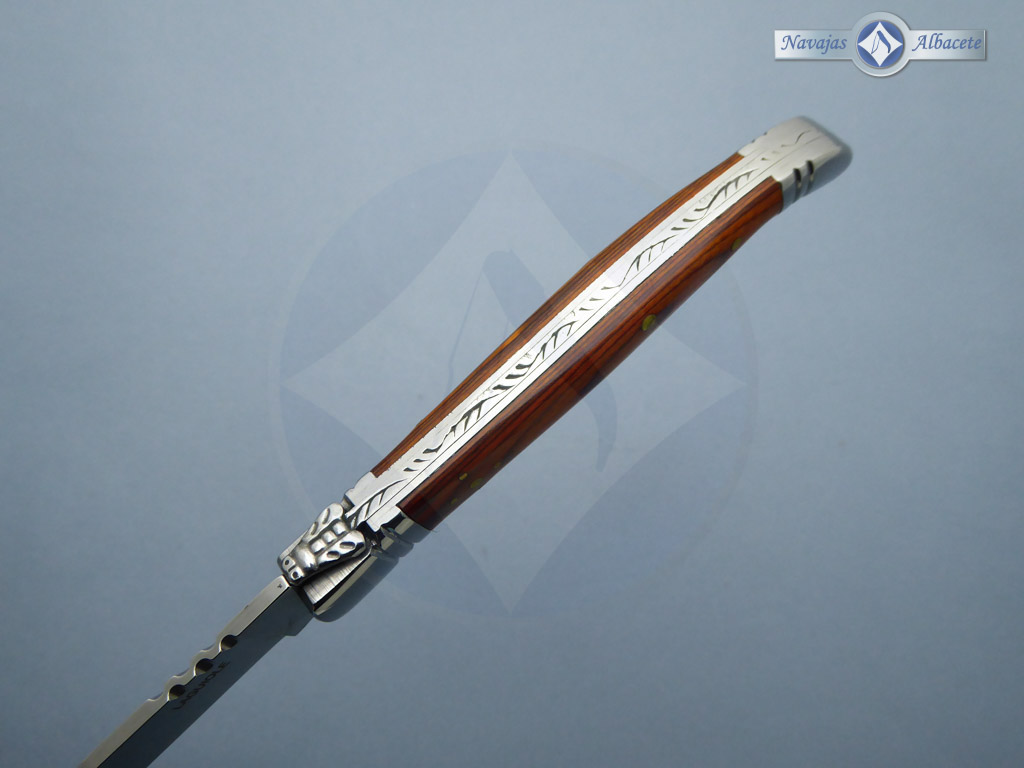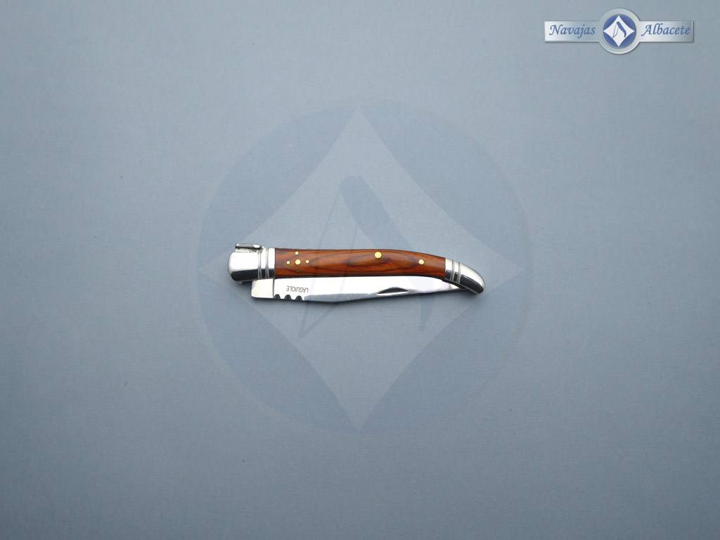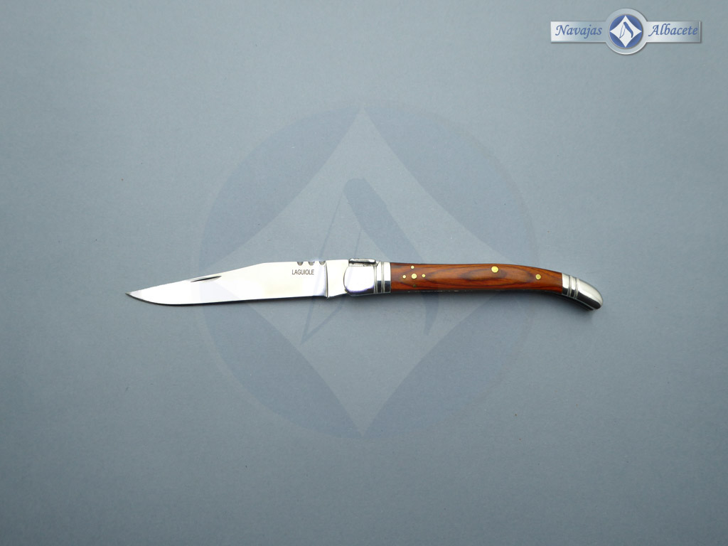 Descripción: Navaja Laguiole con mango de mikarta roja, virola y rebajo en acero. Hoja de acero inoxidable molibdeno vanadio, con uña. Cierre de pistón.
