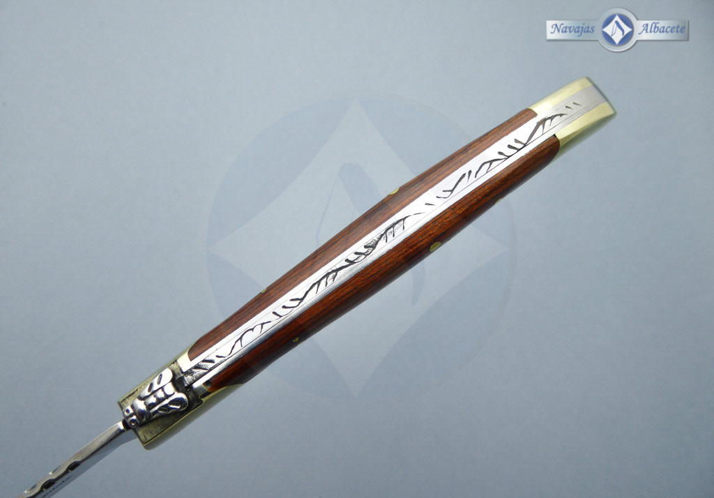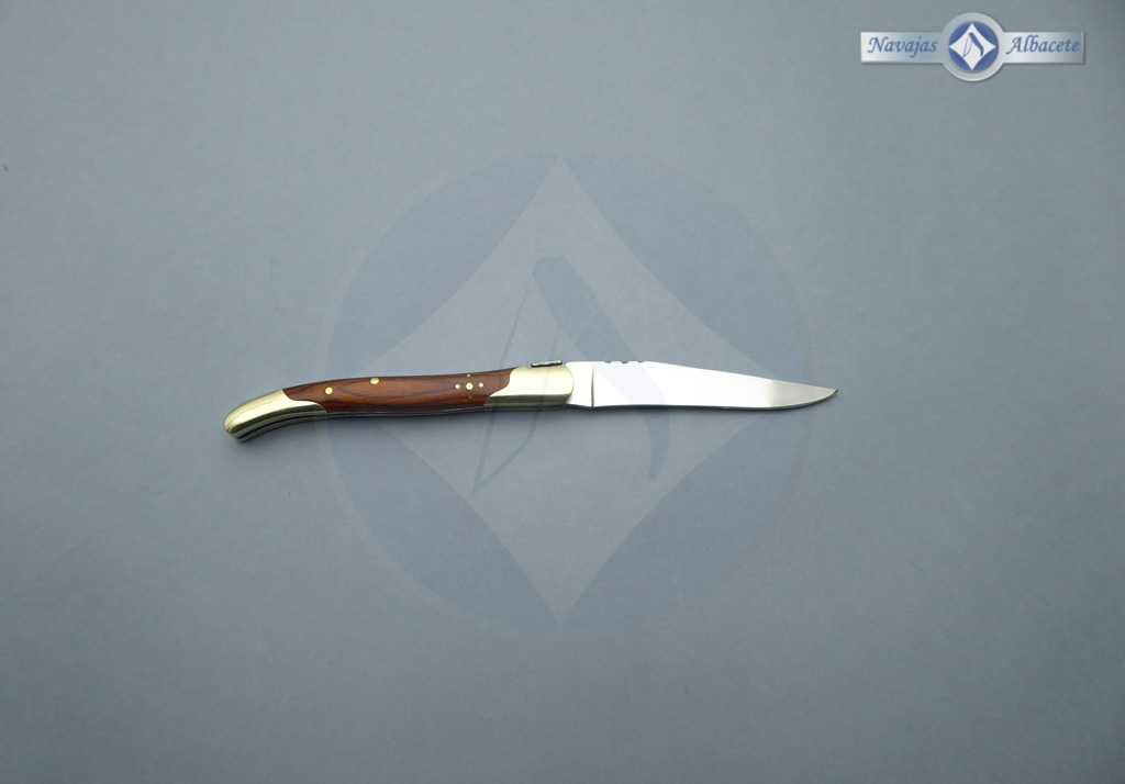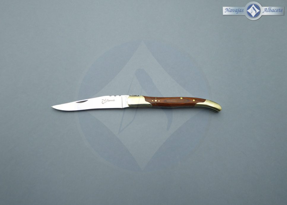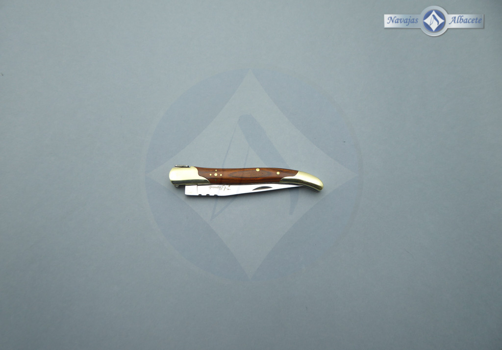 Descripción: Navaja Laguiole Luxury con mango de madera stamina rojo, virola y rebajo en alpaca dorada. Hoja de acero inoxidable acabado espejo, con uña. Cierre de pistón decorado. Diseñaba en España. Disponible en dos tamaños de hoja, seleccione la opción que desee.