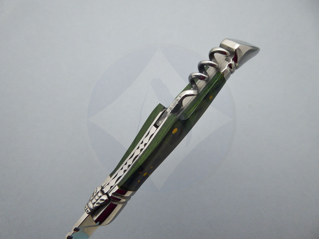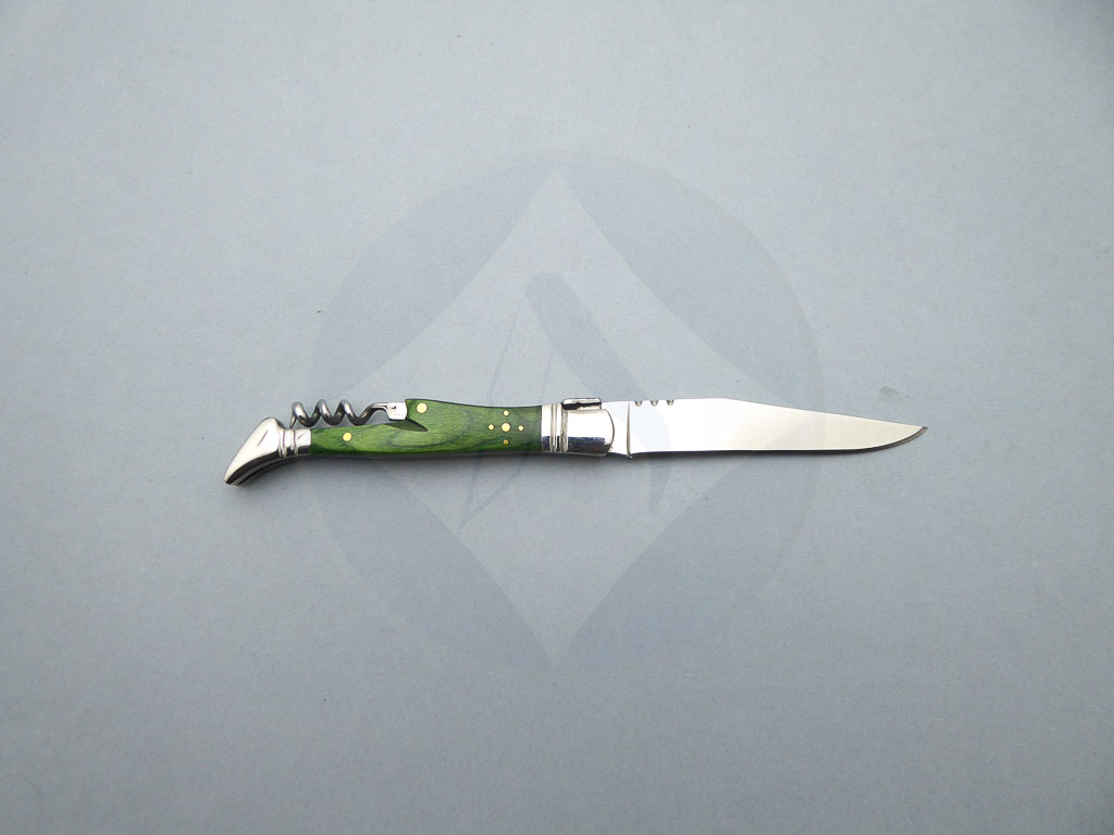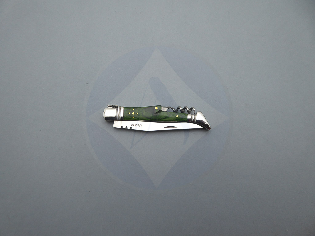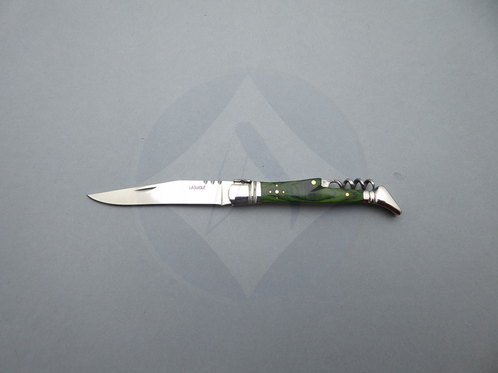 Descripción: Navaja Laguiole con mango de madera stamina color verde, virola y rebajo en acero. Incluye sacacorchos. Hoja de acero inoxidable molibdeno vanadio, con uña para su fácil extracción. Cierre de pistón. Disponible en 2 tamaños de hoja, seleccione la opción que desee.