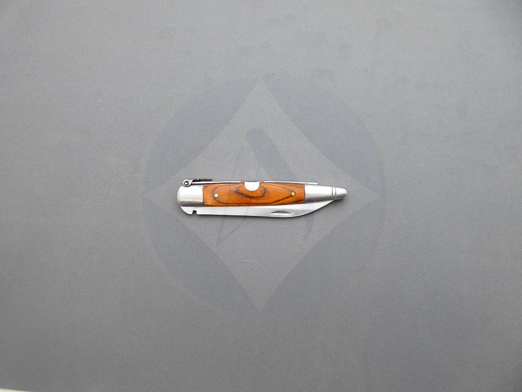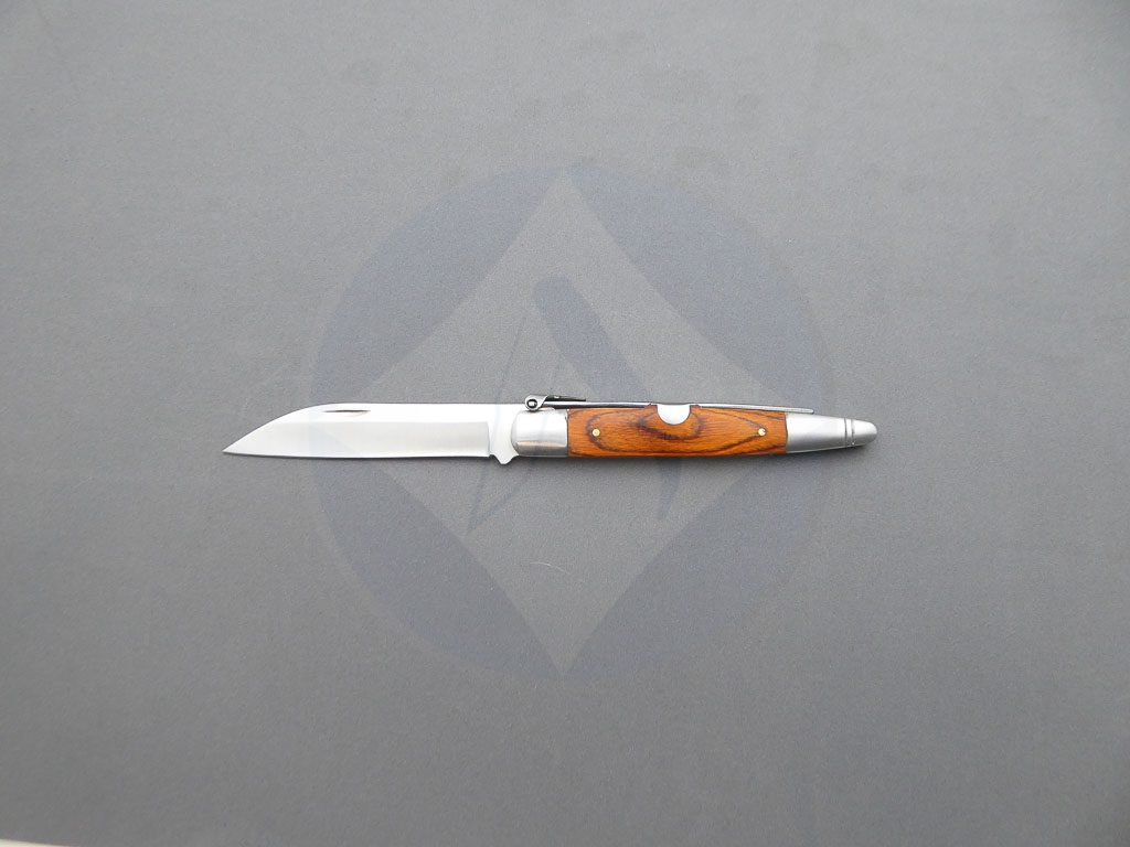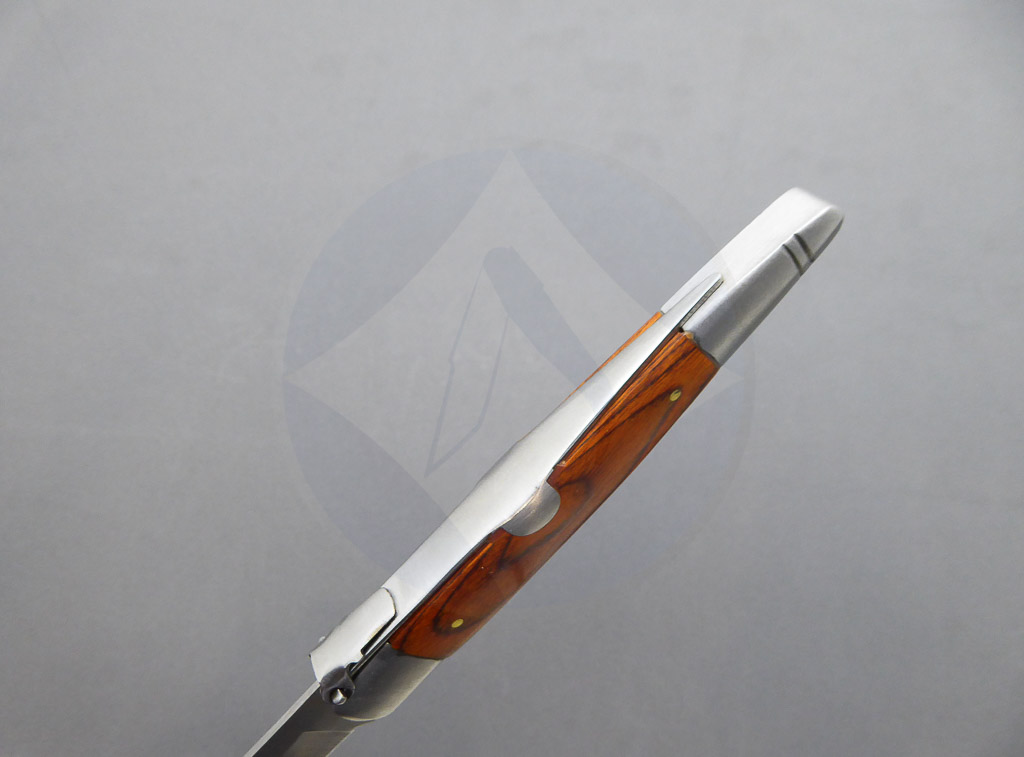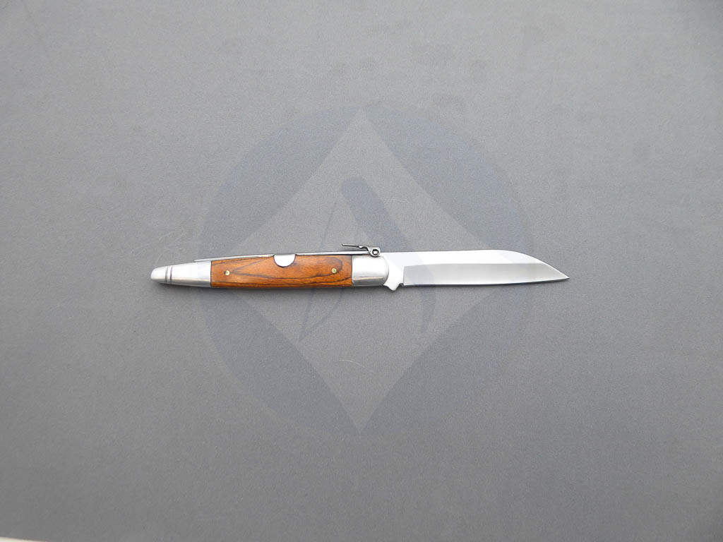 Descripción: Navaja machete con mango en madera stamina roja, virola y rebajo en acero. Hoja de acero inoxidable molibdeno vanadio punta cortada, acabado satinado, con uña para su fácil extracción. El muelle es de acero con palanquilla. Disponible en 2 tamaños de hoja. Seleccione la opción que desee.
