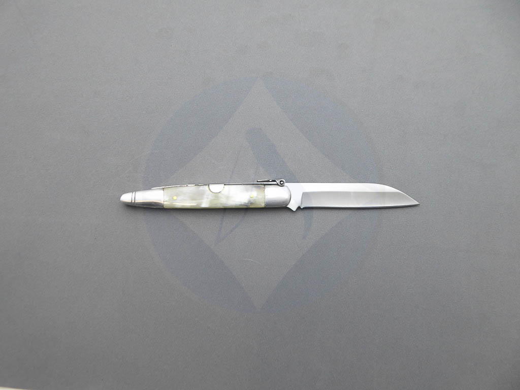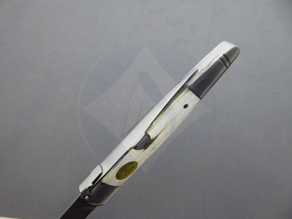 Descripción: Navaja machete con mango en asta de toro auténtica, virola y rebajo en acero. Hoja de acero inoxidable molibdeno vanadio punta cortada, acabado satinado, con uña para su fácil extracción. El muelle es de acero con palanquilla. Disponible en 2 tamaños de hoja. Seleccione la opción que desee.