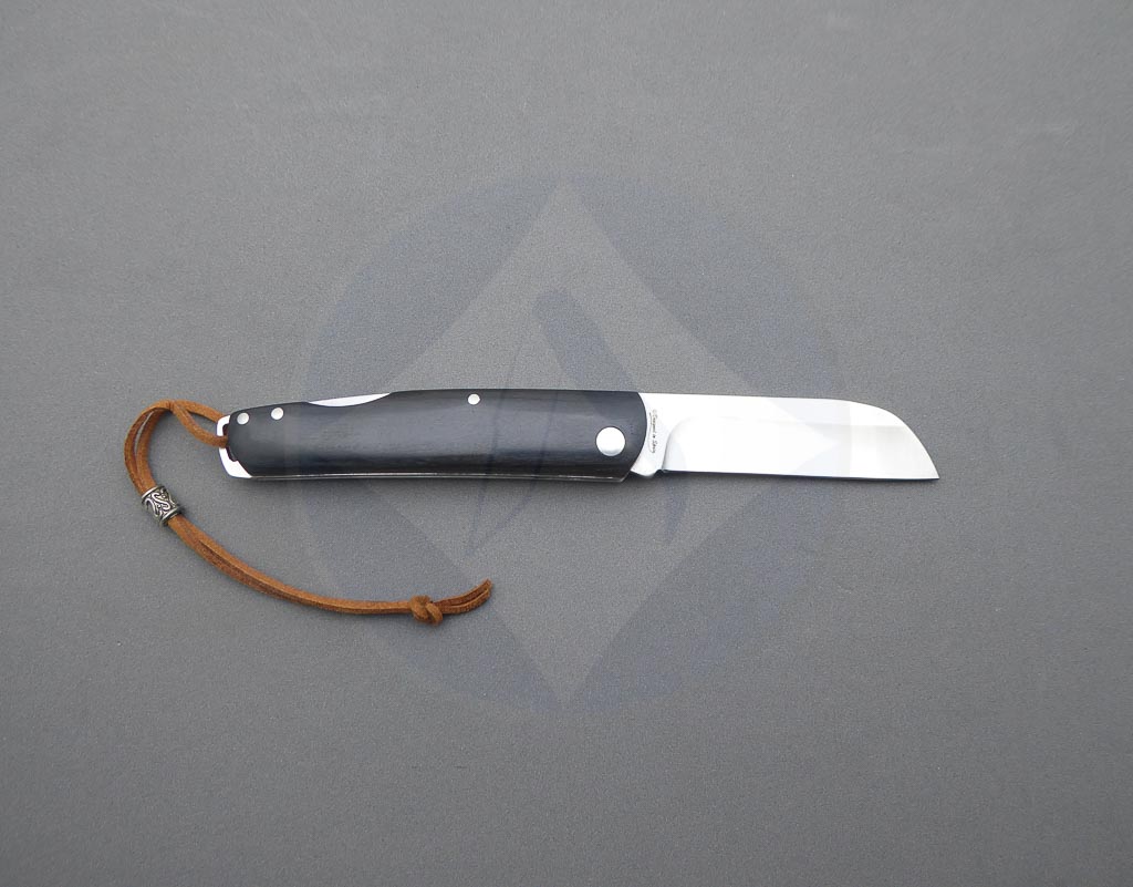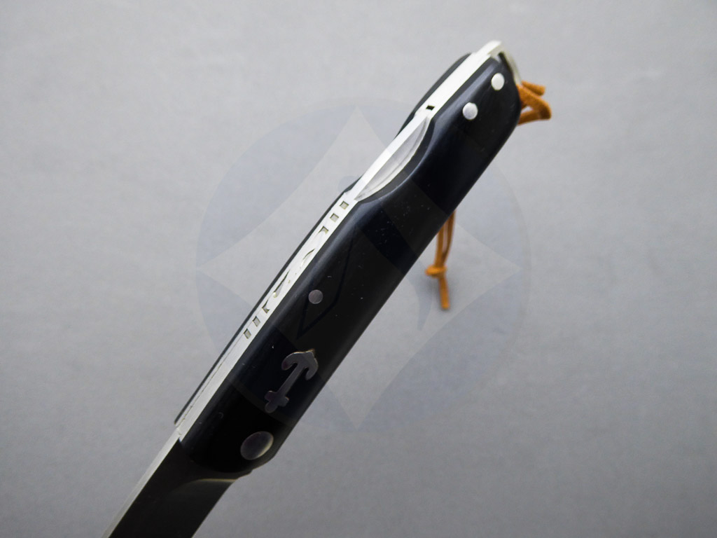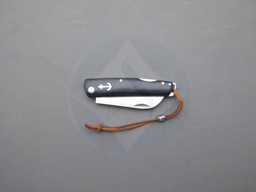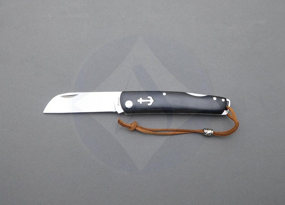 Descripción: Navaja marinera con mango de madera stamina negra decorada con ancla y remaches, con ojal de acero en el pomo y cordón con detalle metálico. Hoja de acero inoxidable molibdeno vanadio, con uña para su fácil extracción. Bloqueo de seguridad back lock. Diseñada en España.