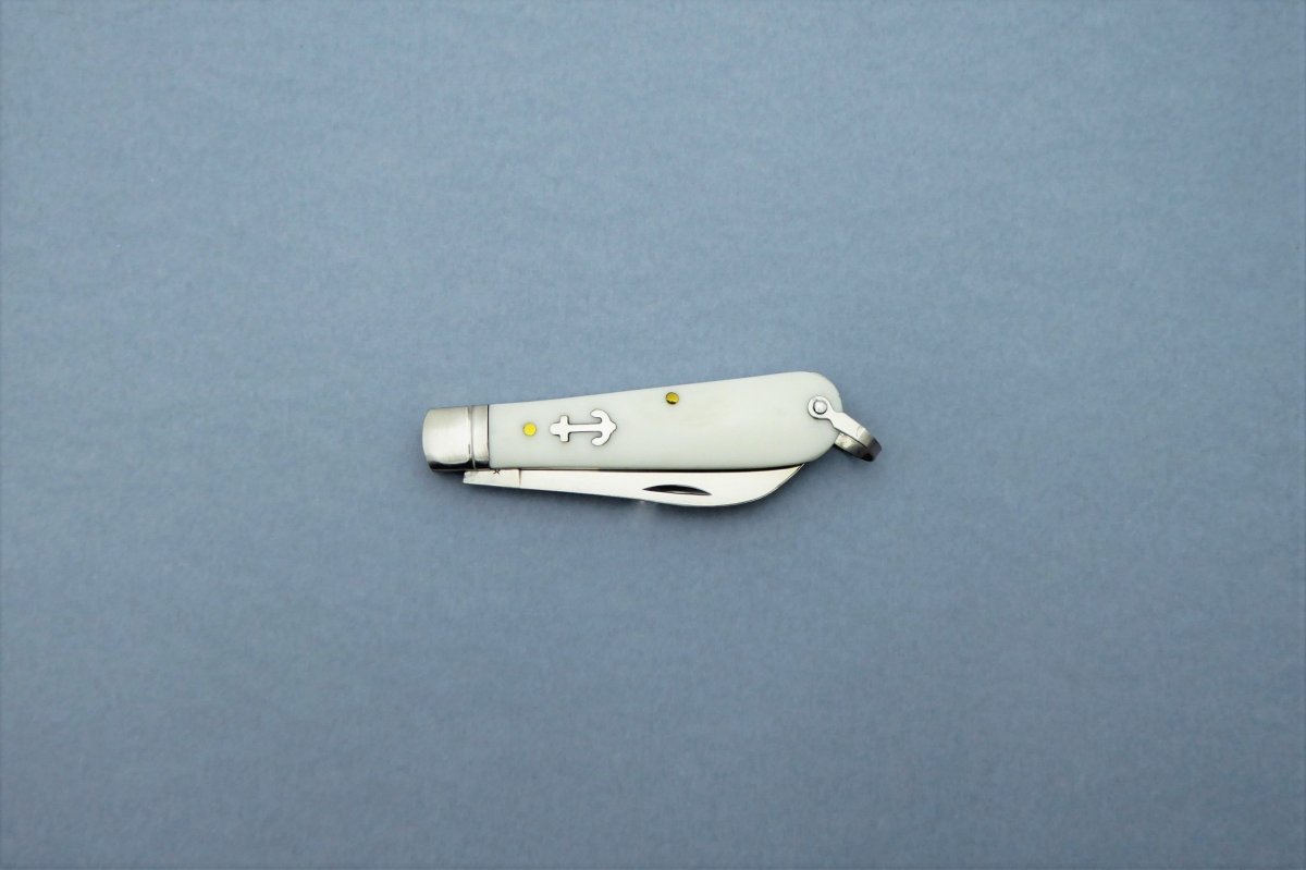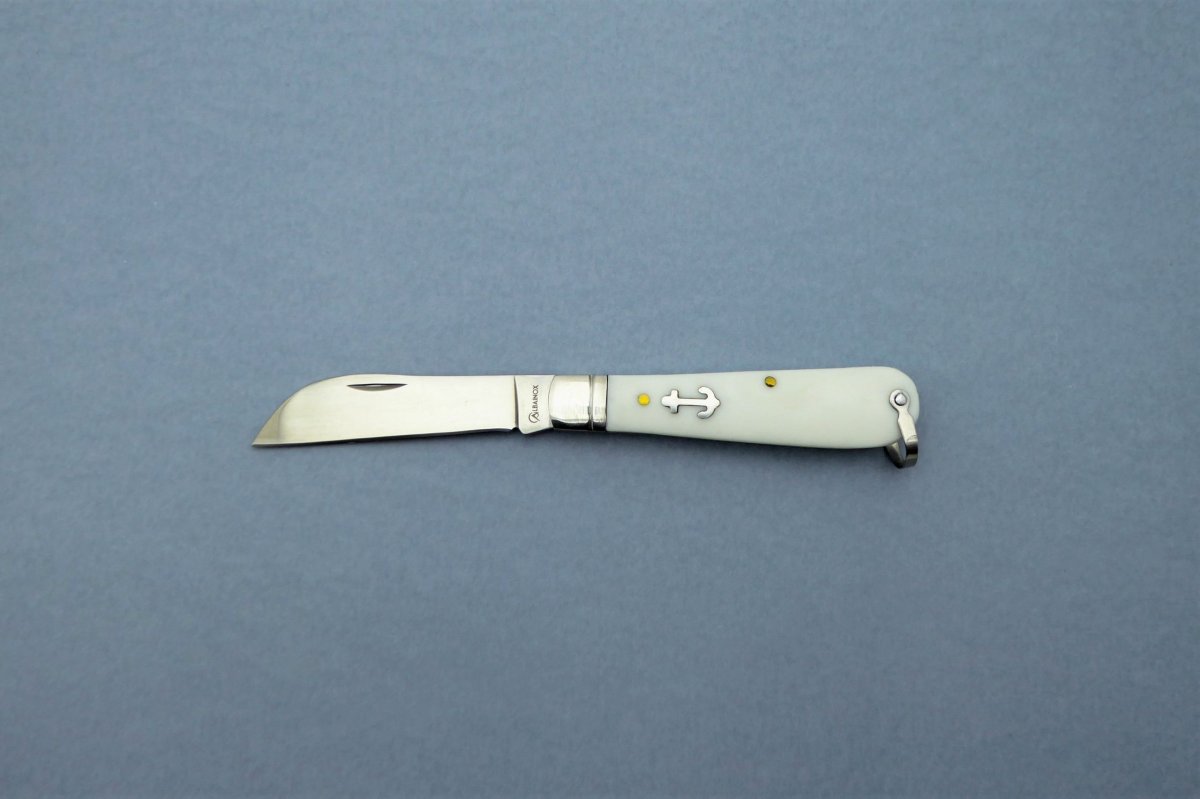 Descripción: Navaja marinera con mango en plástico ABS blanco decorado con un ancla, virola de acero, con anilla plegable en el pomo. Hoja de acero inoxidable molibdeno vanadio, pico de loro. Con uña para su fácil extracción. Cierre de pistón