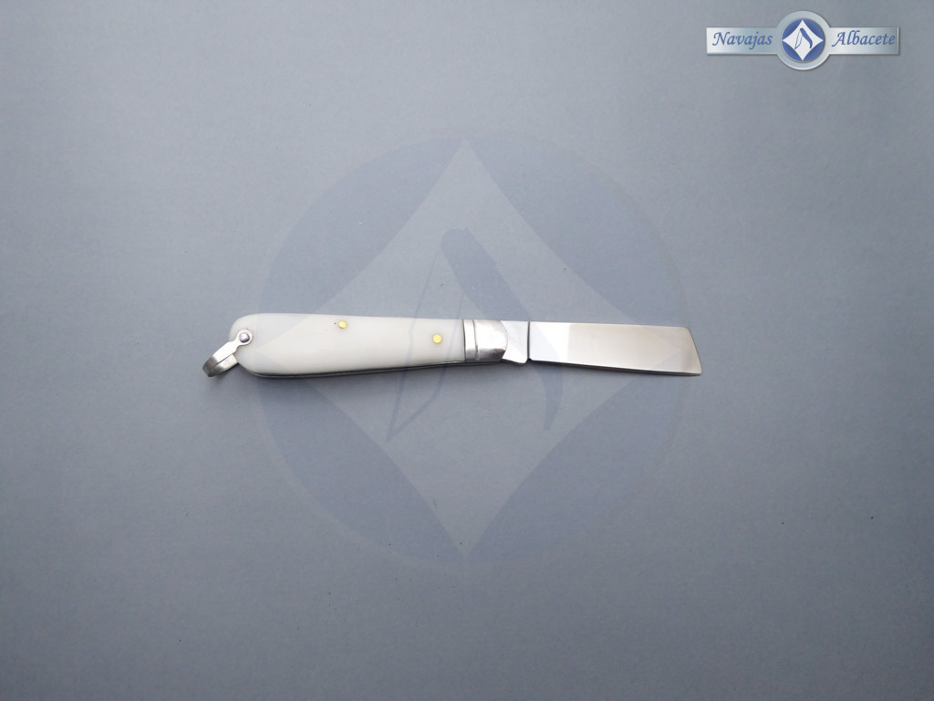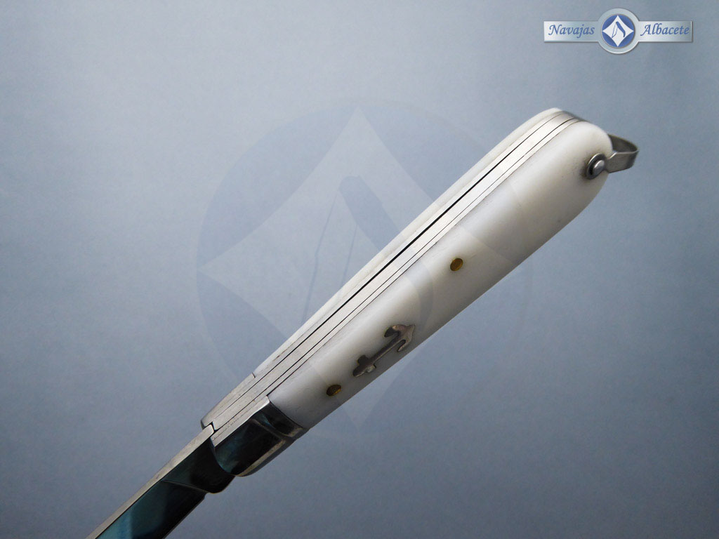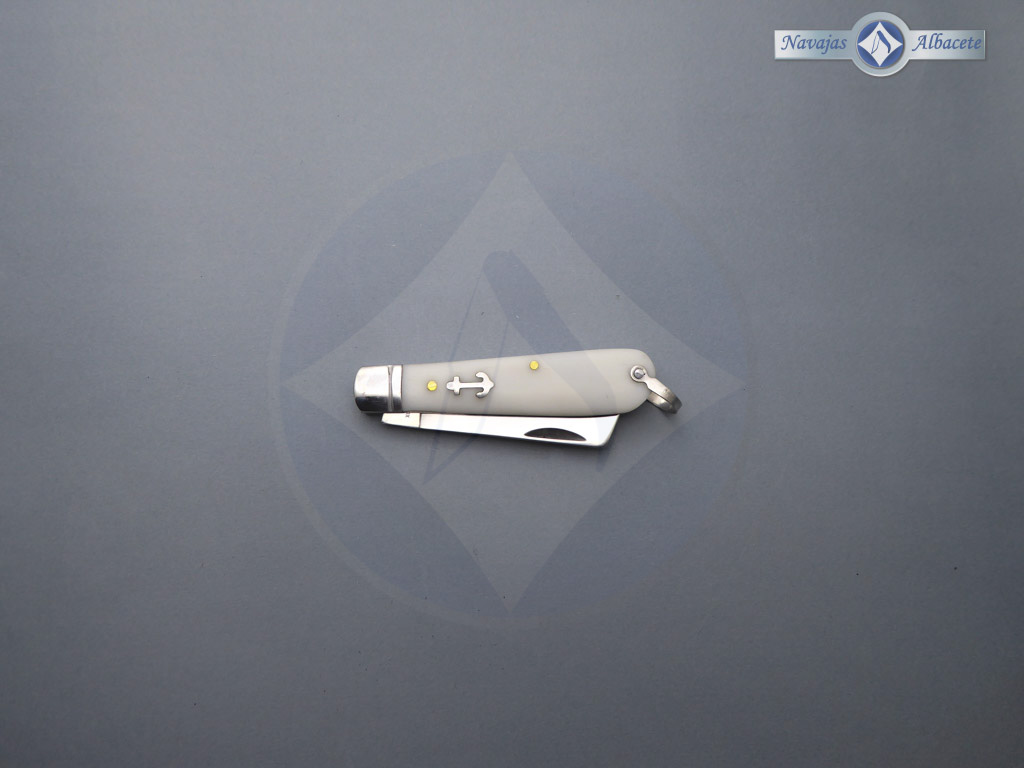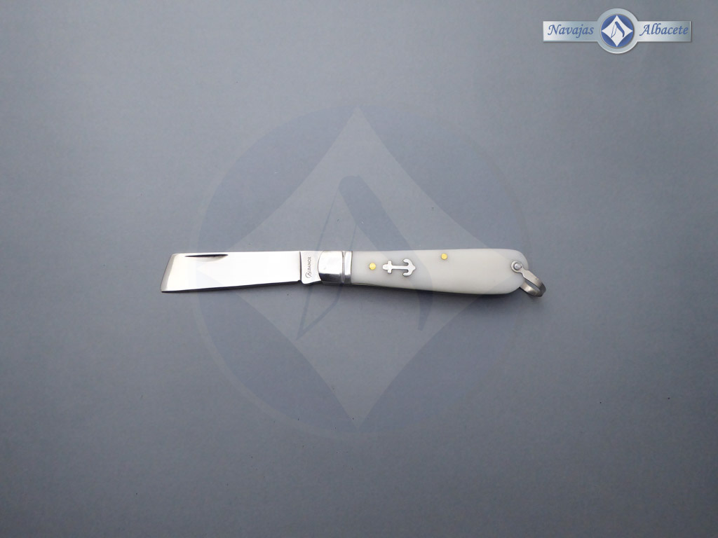 Descripción: Navaja marinera con mango en plástico ABS color blanco decorado con un ancla, virola de acero. Anilla plegable en el pomo. Hoja de acero inoxidable molibdeno vanadio, acabado espejo, punta cortada. Con uña para su fácil extracción. Cierre de pistón.