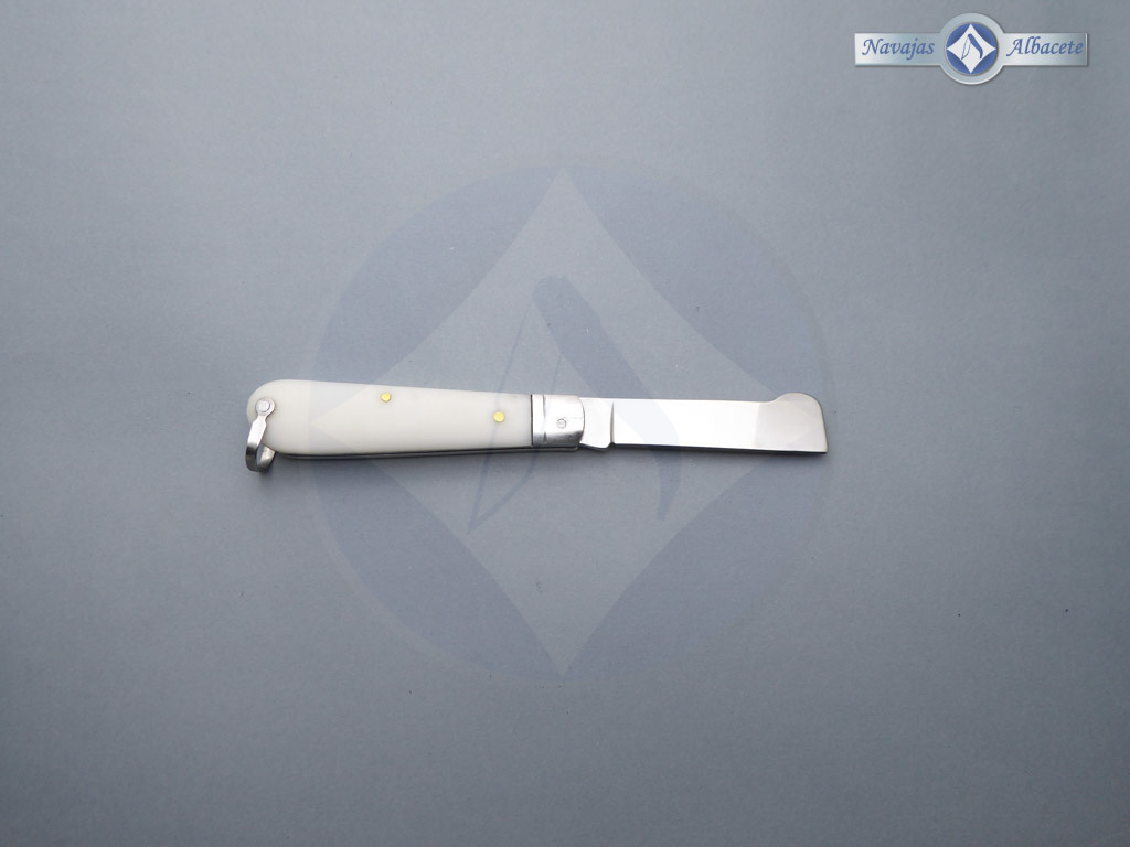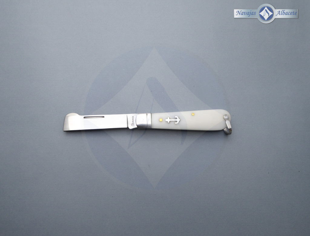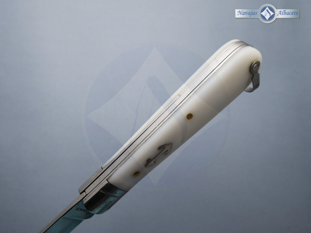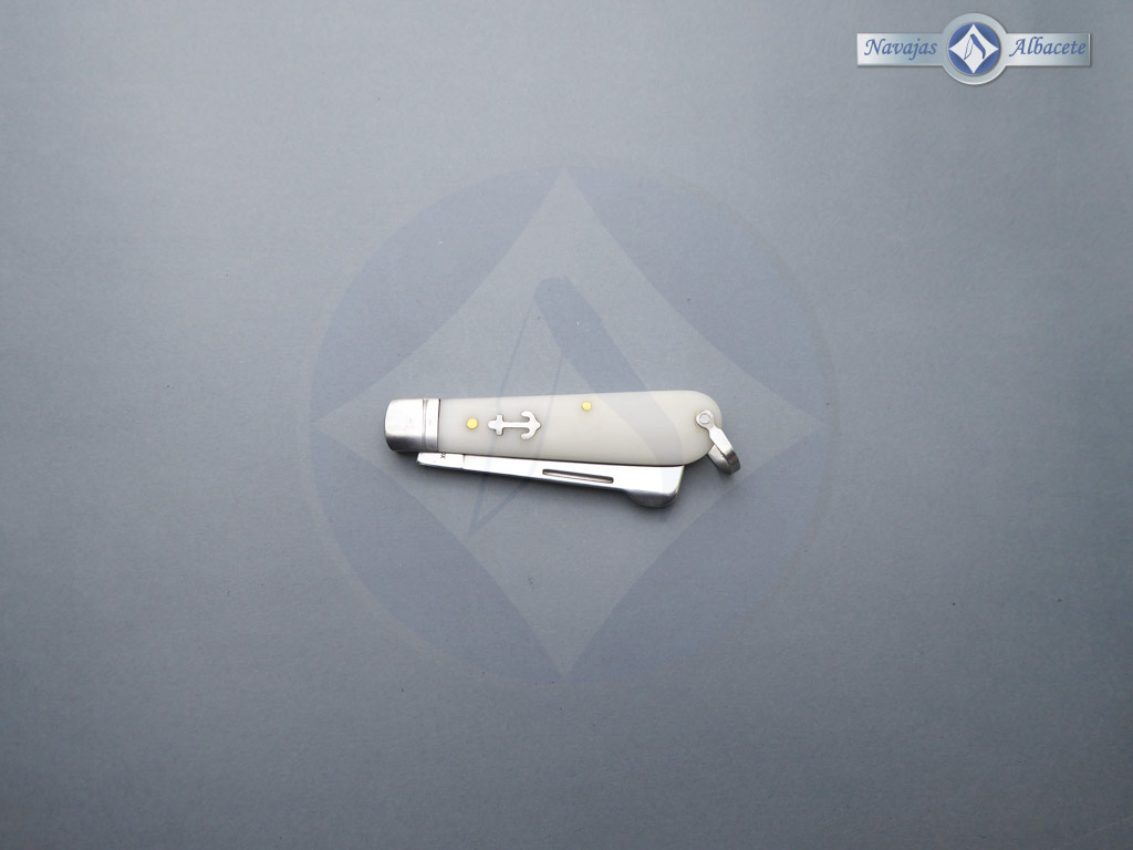 Descripción: Navaja marinera con mango de plástico ABS color blanco decorado con un ancla, virola de acero, anilla plegable en el pomo. Hoja de acero inoxidable acabado satinado. Con uña para su fácil extracción. Cierre de pistón.