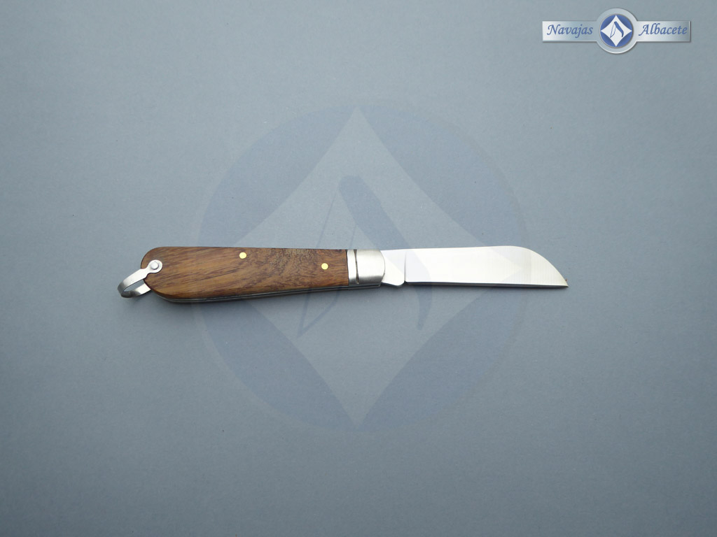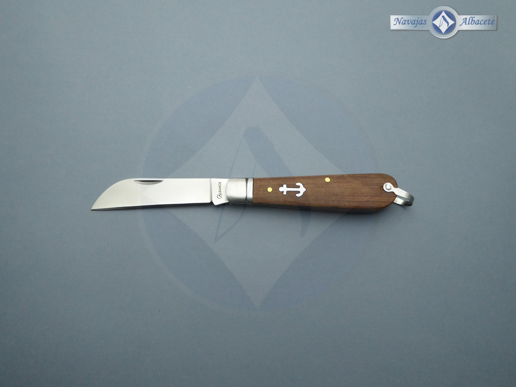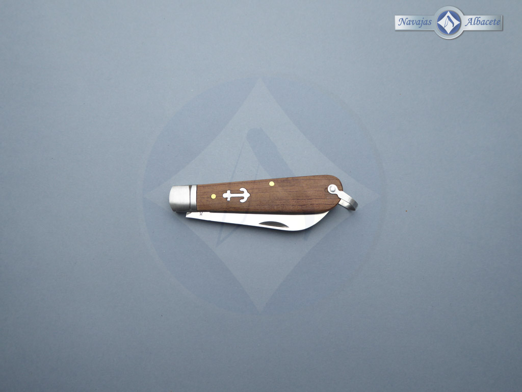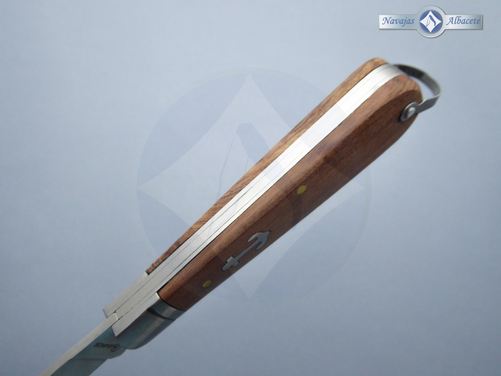 Descripción: Navaja marinera con mango de madera decorado con un ancla, virola de acero, con anilla plegable en el pomo. Hoja de acero inoxidable acabado satinado. Con uña para su fácil extracción. Cierre de pistón.