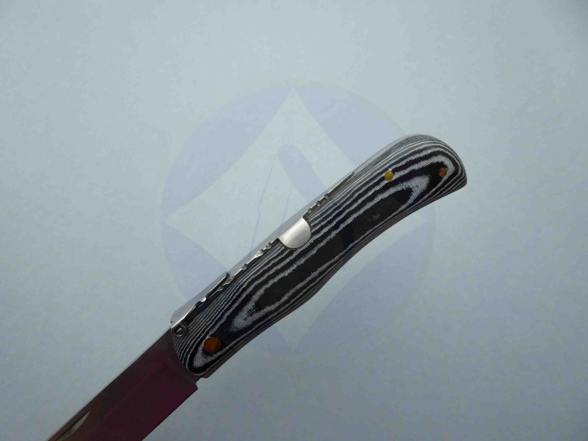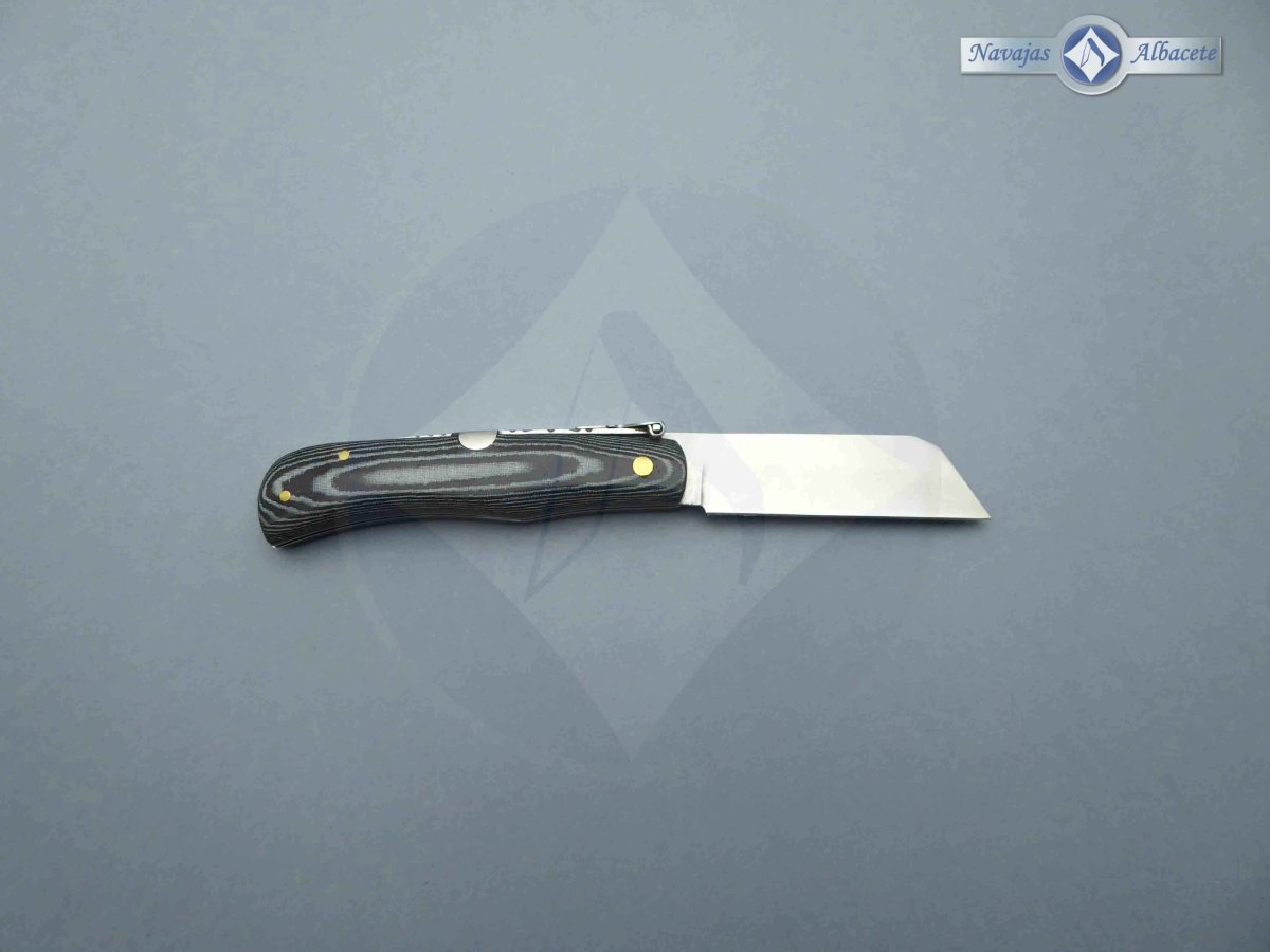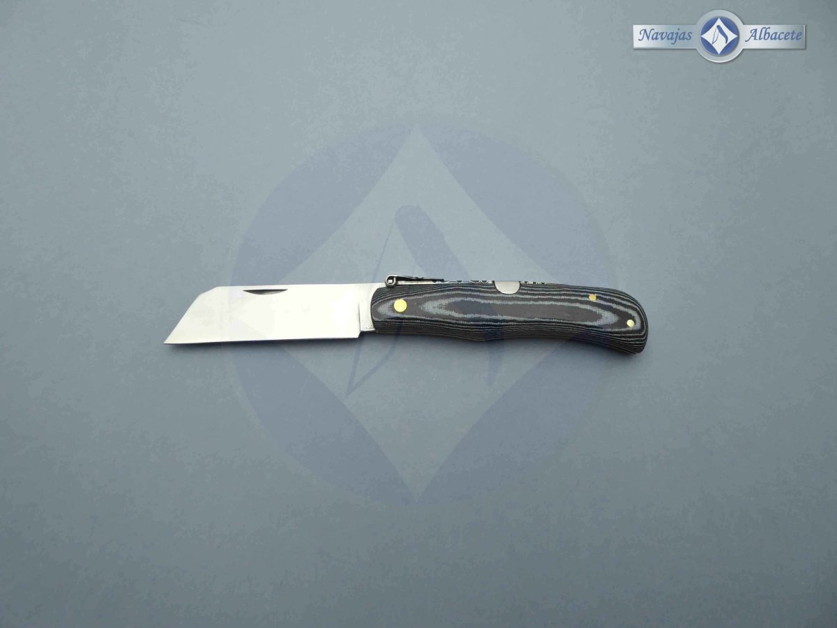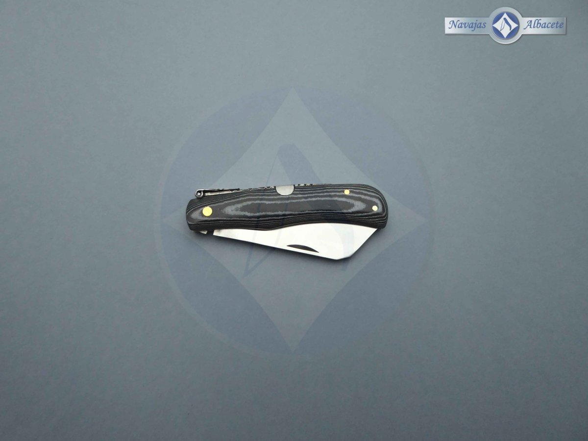 Descripción: Navaja campera con puño en mikarta negra y hoja de acero carbono, de gran dureza y resistencia. Con uña para su fácil extracción. Sistema de cierre palanquilla.