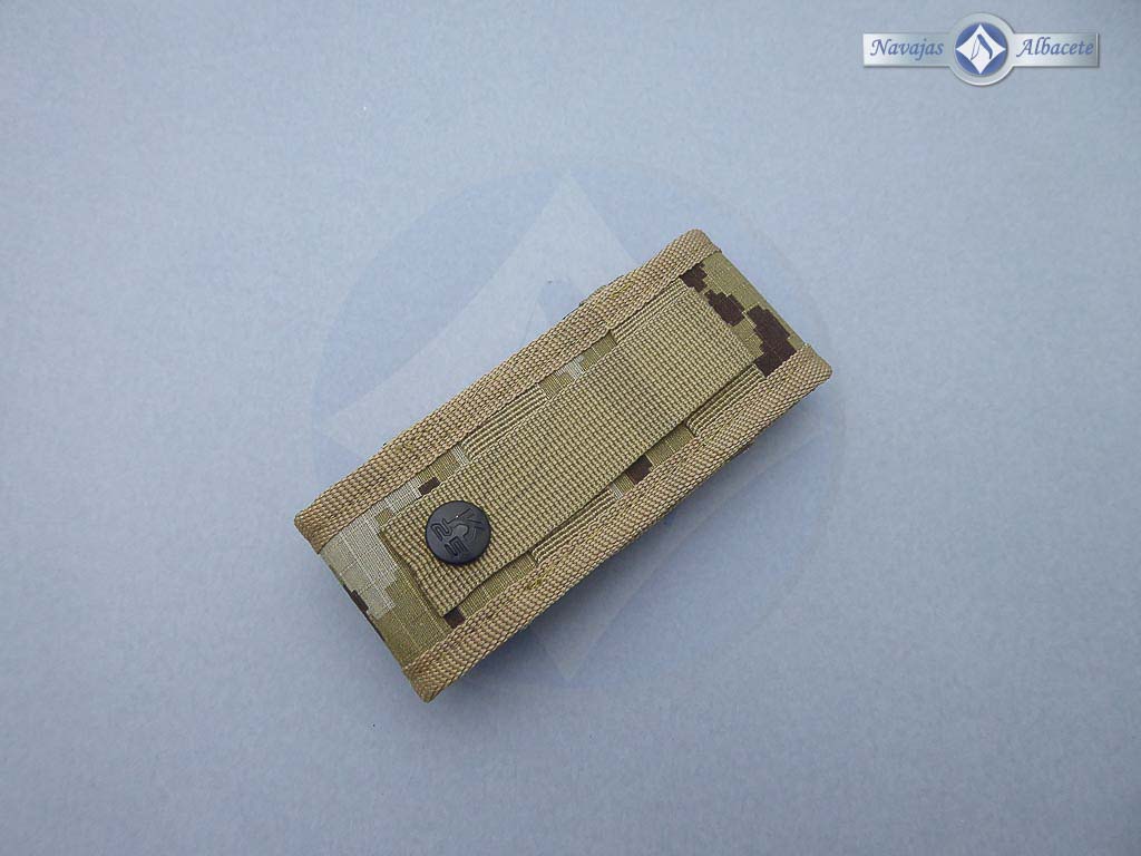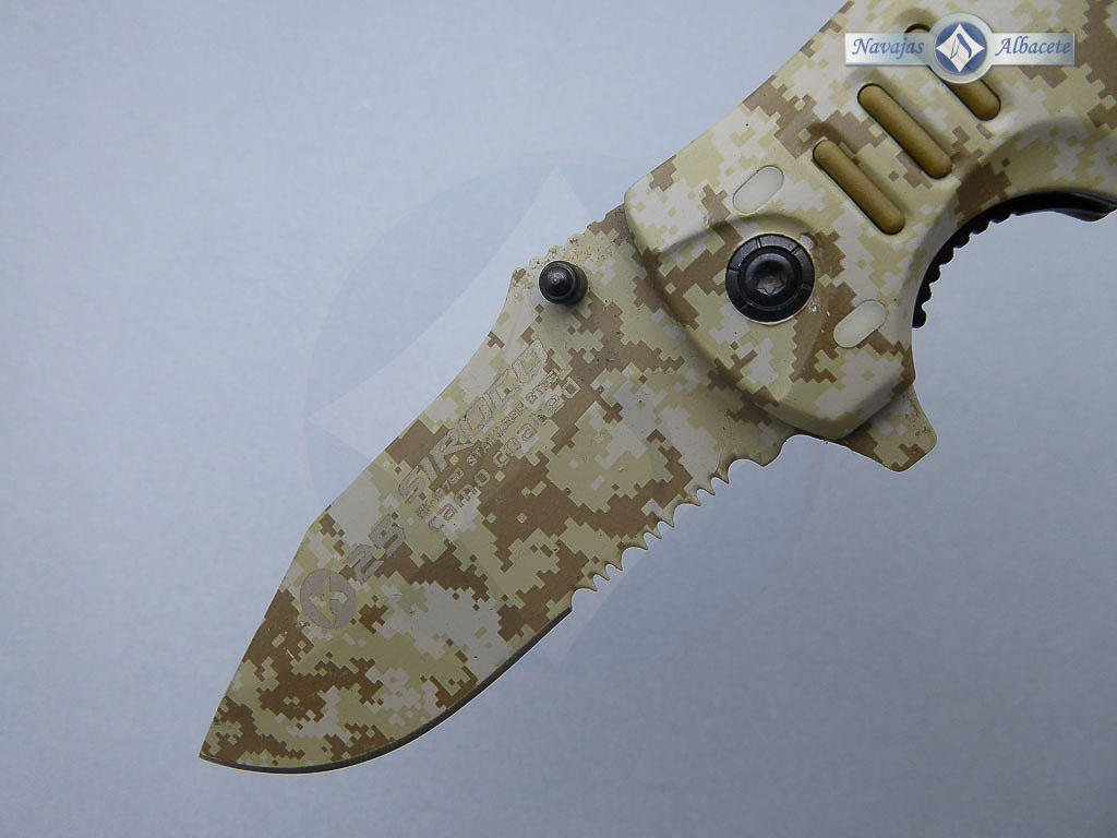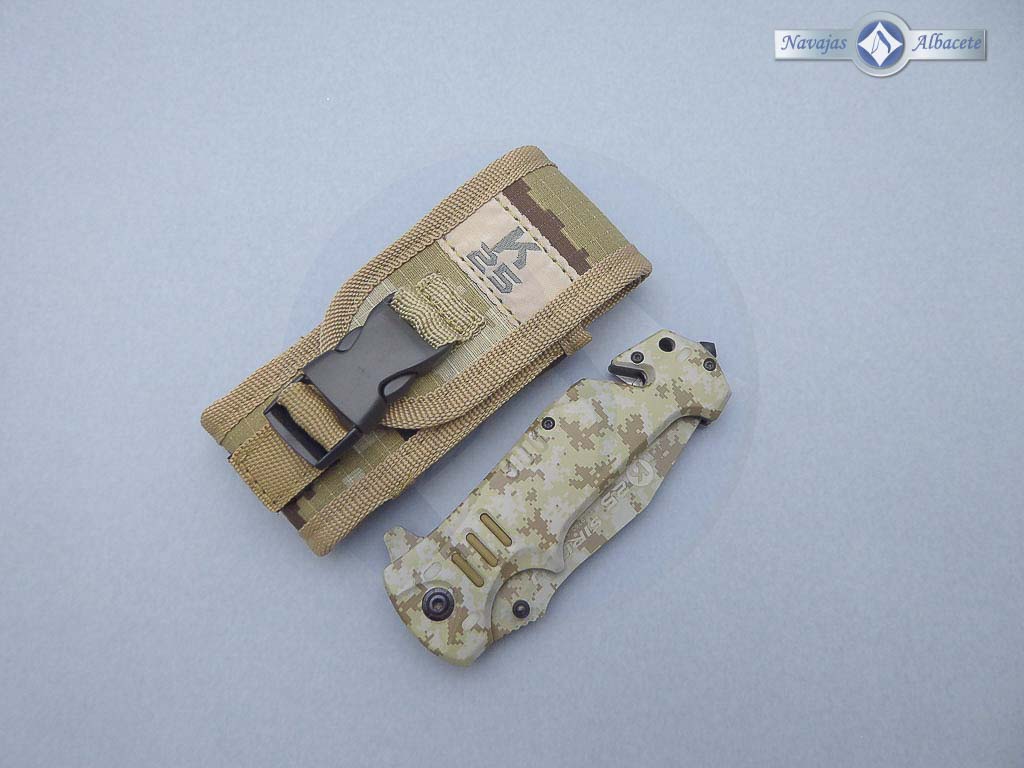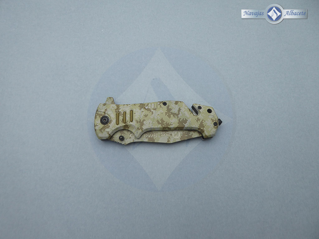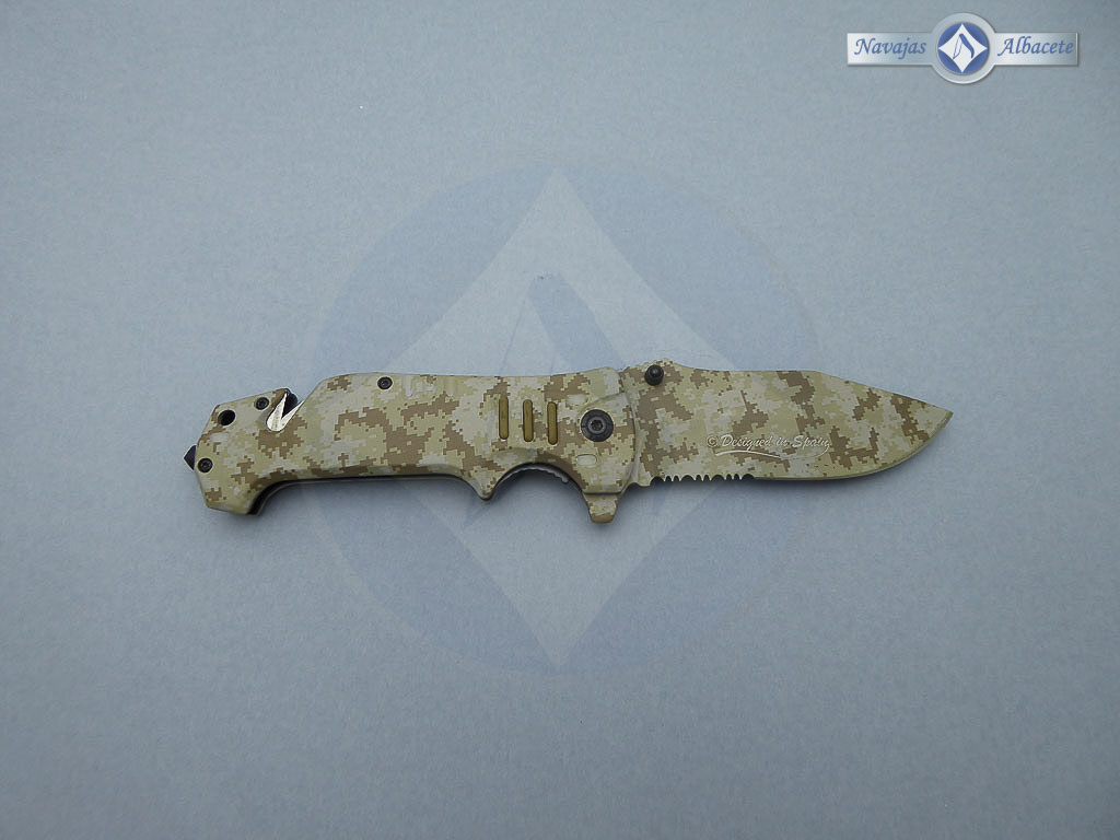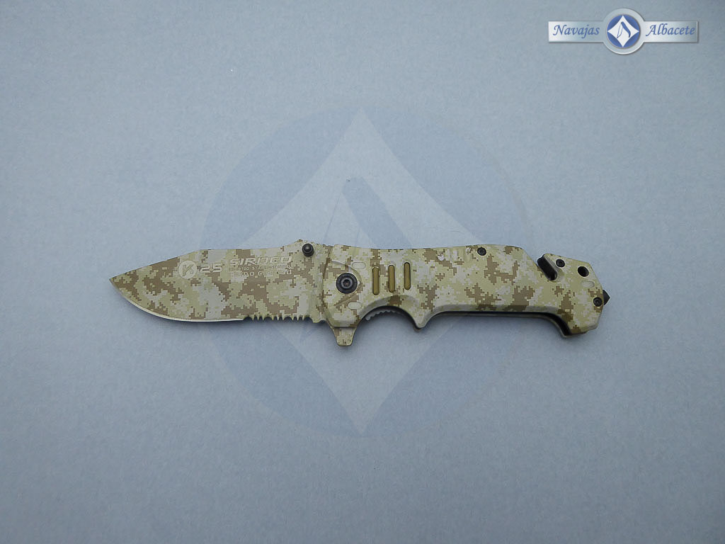 Descripción: Navaja táctica K25 «Siroco» con mango de aluminio color camuflaje, con inserciones visibles en la oscuridad. Hoja de acero inoxidable molibdeno vanadio de gran resistencia, con sierra parcial en el filo, camo coated. Bloqueo de seguridad Liner lock. Incluye punta rompe vidrio, cúter corta cinturón de doble cuchilla y funda de nylon a juego, adaptable con clip y sistema molle, ofreciendo un sistema óptimo de enganches. Diseñada en España.