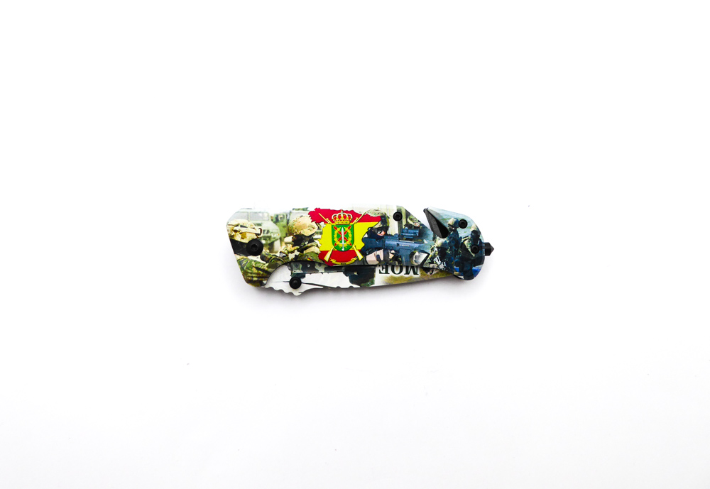 Descripción: Navaja táctica «MOE» con mango en aluminio con impresión fotográfica efecto 3D. Hoja en acero molibdeno vanadio con impresión escrita MOE y fotografía efecto 3D. Punta rompecristales, clip porta cinturón, bloqueo de seguridad linear lock y cúter corta cinturón de una cuchilla. Diseñada en España.