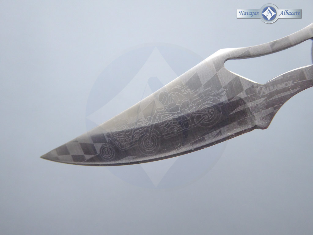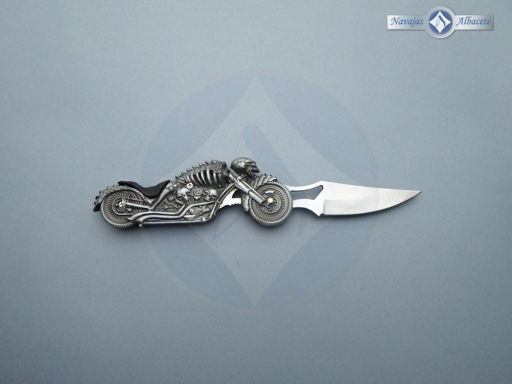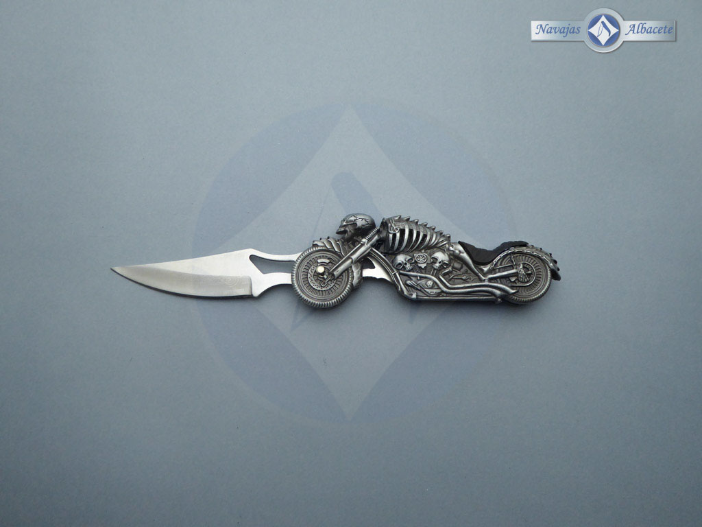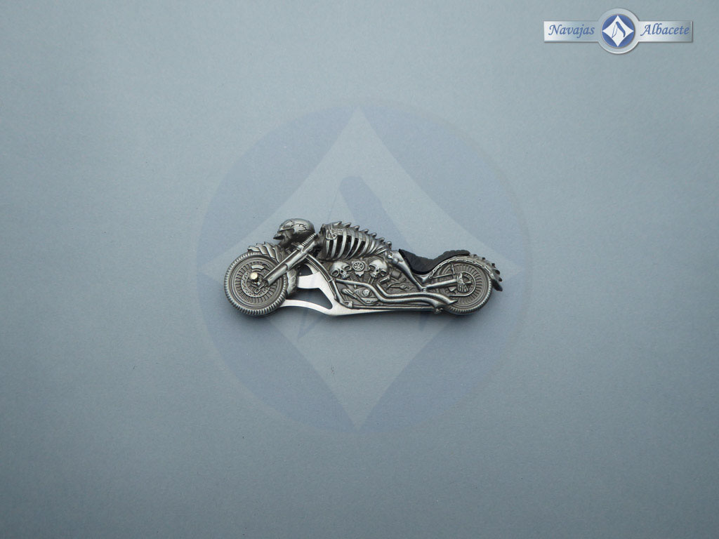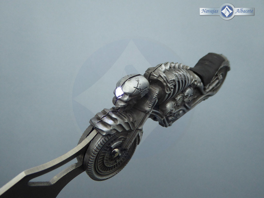 Descripción: «Moto calavera» Navaja fantasía con mango en aluminio 3D. Hoja en acero inoxidable molibdeno vanadio calada grabada a laser. Bloqueo de seguridad linear lock. El faro de la moto se ilumina con un led al apretar el asiento.