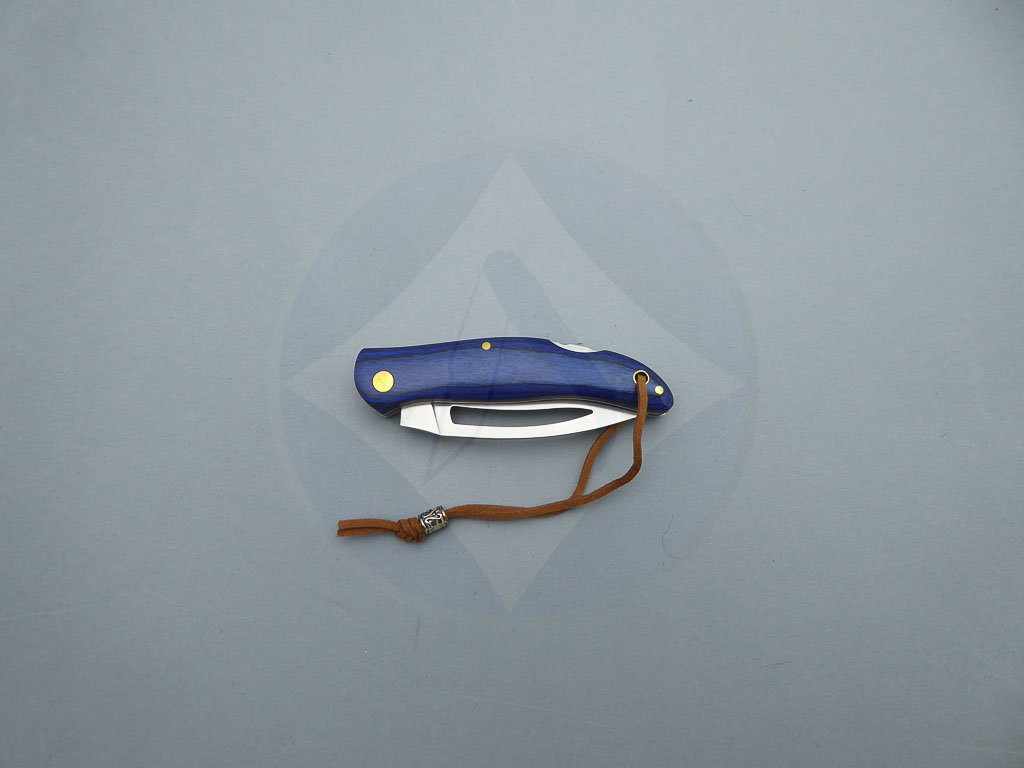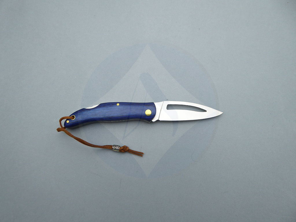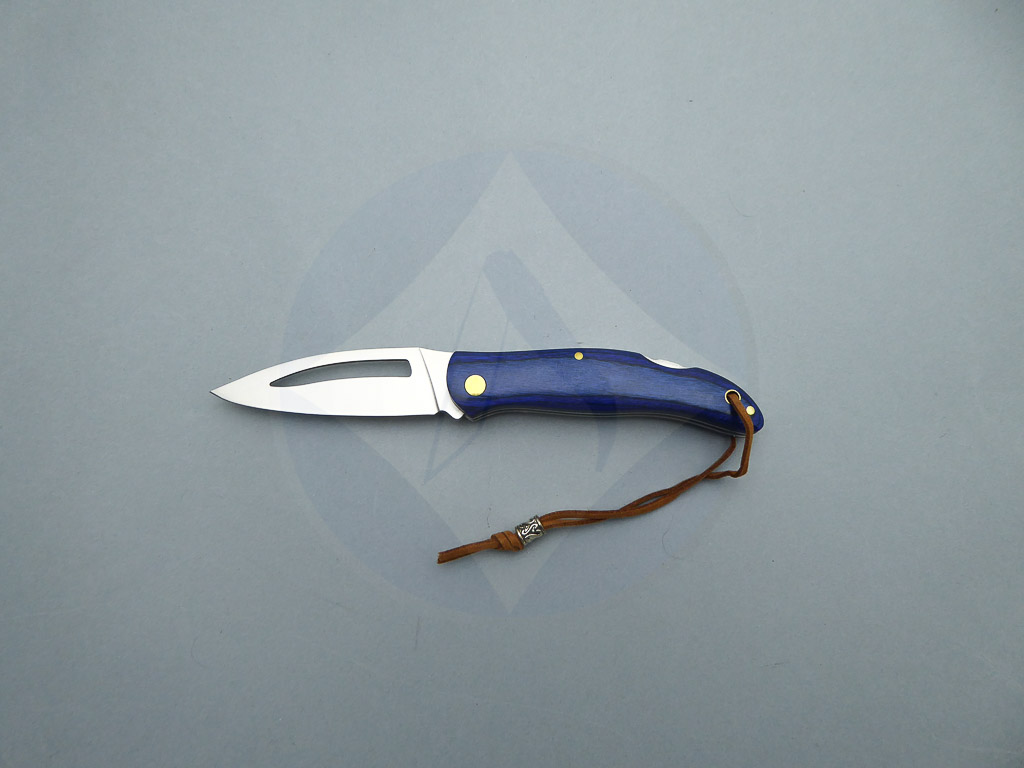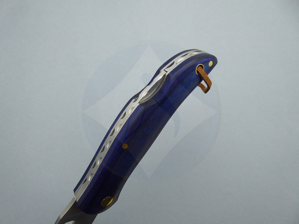 Descripción: Navaja con mango de madera stamina color azul. Hoja de acero inoxidable molibdeno vanadio calada, acabado satinado. Bloqueo de seguridad Back lock. Muelle decorado. Ojal en el pomo con cordón con detalle metálico. Diseñada en España.