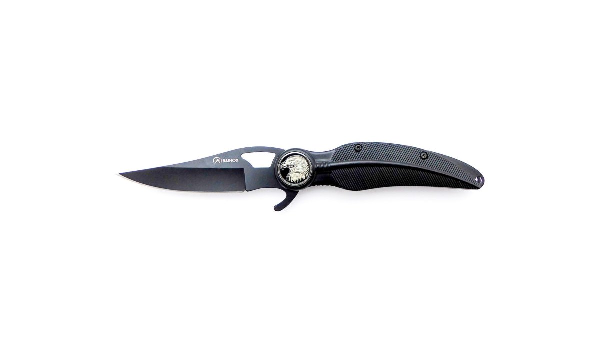 Descripción: Navaja fantasía PLUMA ÁGUILA con mango de aluminio color negro en forma de pluma. Hoja de acero inoxidable molibdeno vanadio acabado negro. Sistema de bloqueo Liner Lock. Con clip trasero para cinturón.