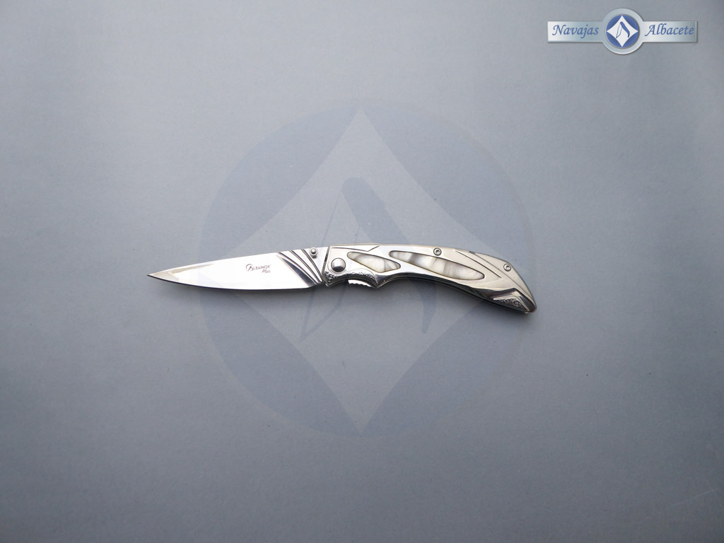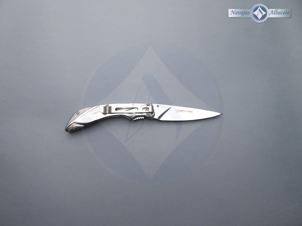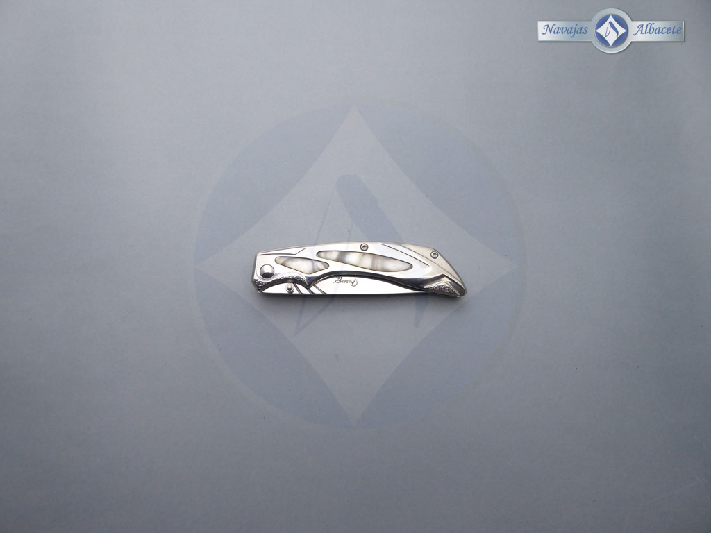 Descripción: Navaja «Plus» tipo fantasía con mango de acero con inserto de pieza de imitación nácar blanco. Hoja de acero inoxidable acabado espejo. Bloqueo de seguridad Liner lock. Incluye clip trasero para cinturón y funda de terciopelo negro. Diseñada en España.