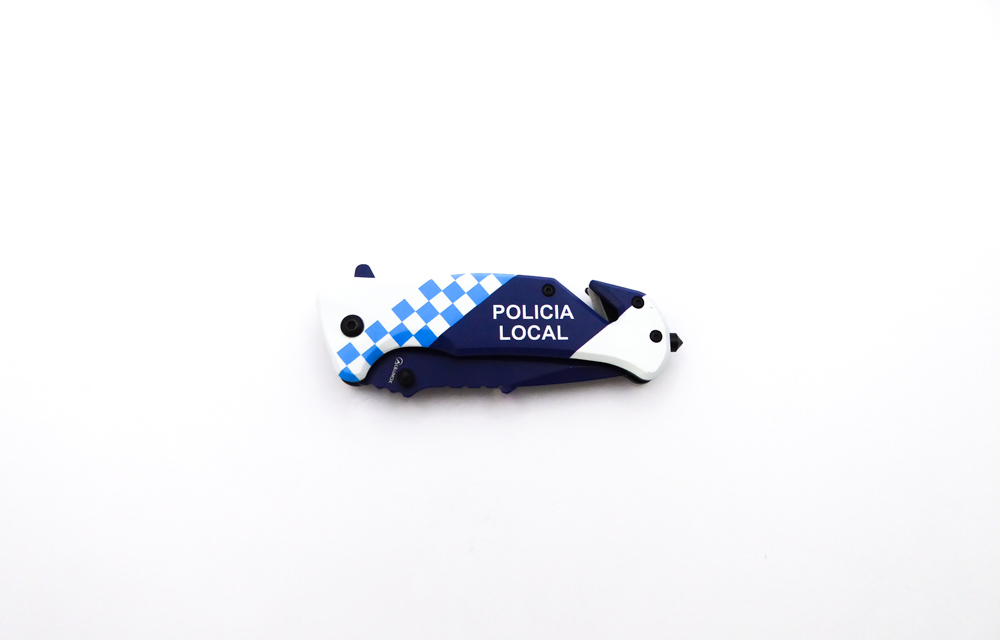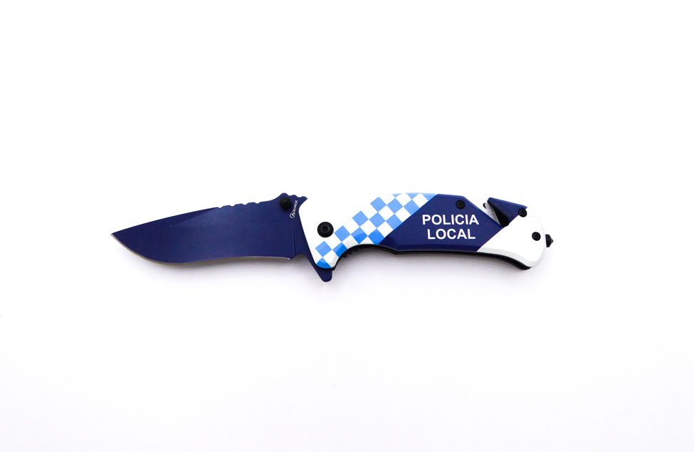 Descripción: Navaja táctica «Policía Local» con mango en aluminio con impresión Policía Local efecto 3D. Hoja en acero molibdeno vanadio acabado azul marino. Punta rompecristales, clip porta cinturón, bloqueo de seguridad linear lock y cúter corta cinturón de una cuchilla. Diseñada en España.