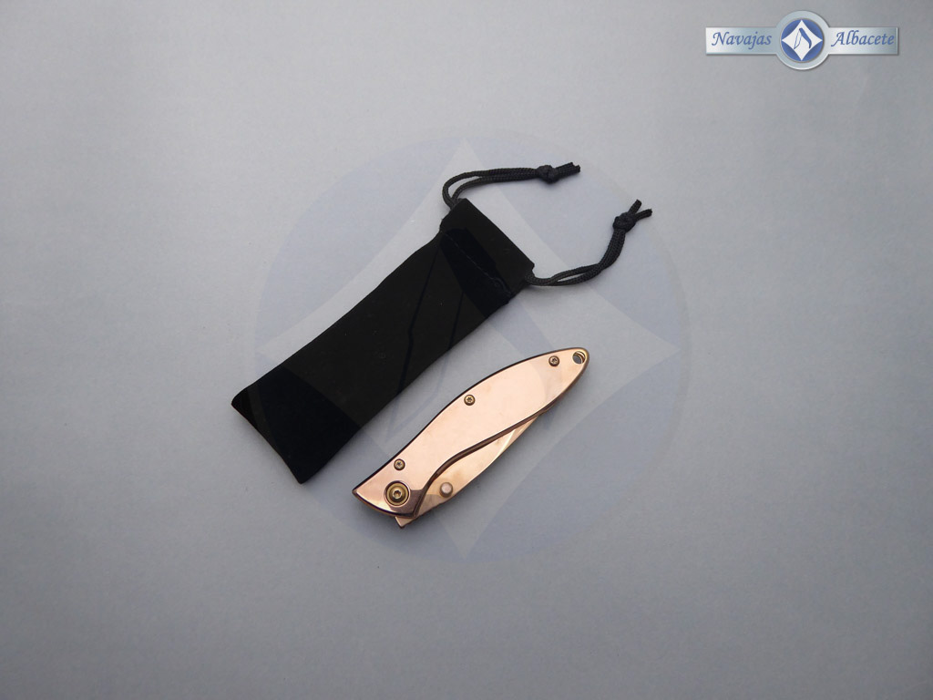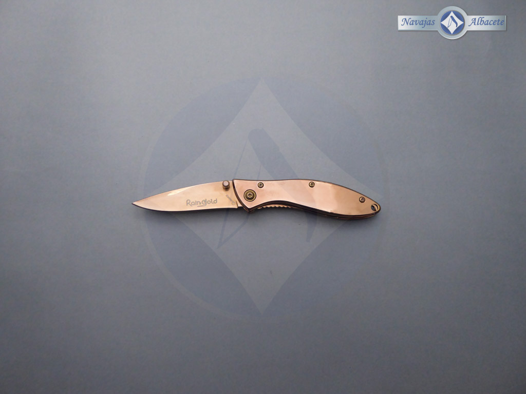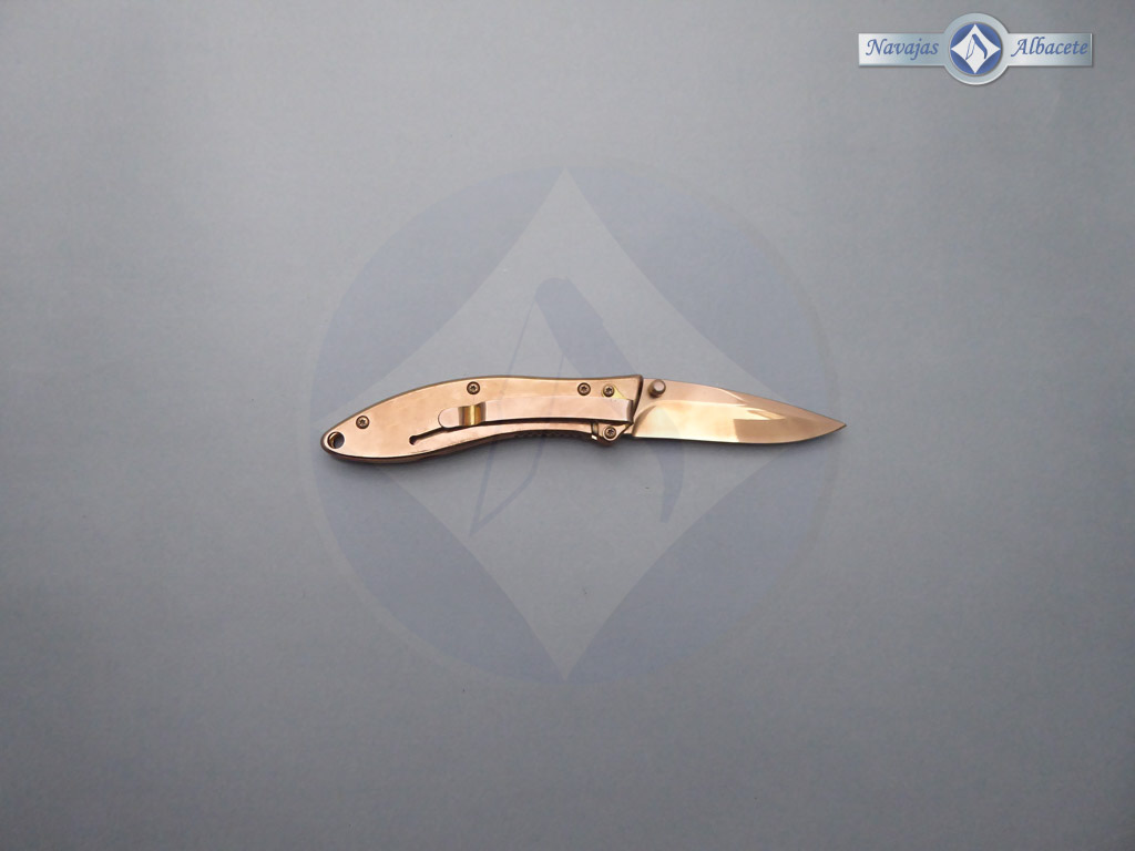 Descripción: Navaja «titanio Raingold» tamaño bolsillo, con mango de acero con acabado Raingold. Hoja de acero inoxidable molibdeno vanadio con acabado Raingold. Sistema de bloqueo Liner lock. Incluye funda de terciopelo negro y clip trasero.