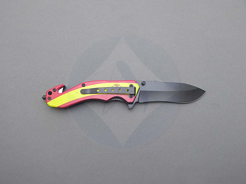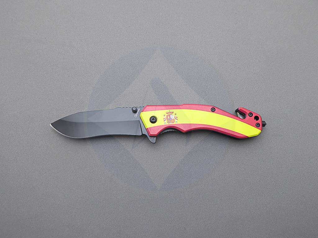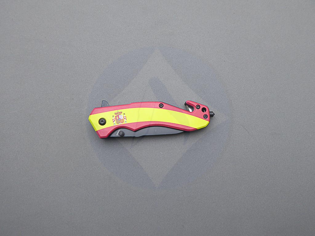 Descripción: Navaja de rescate con mango ABS con diseño de la bandera de España. Hoja de acero inoxidable molibdeno vanadio, acabado negro. Bloqueo Liner lock. Incluye clip trasero, cúter corta cinturón de una cuchilla y punta rompe cristales.