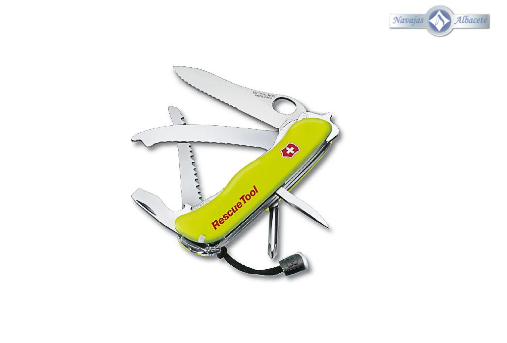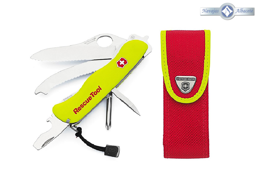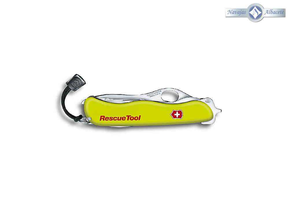 Descripción: Navaja de rescate «Rescue Tool» con 13 funciones y mango ergonómico para un excelente agarre, color amarillo fluorescente para localizarla en la oscuridad. Hoja de acero inoxidable de 8,5 cm con bloqueo para una mano con 2/3 de filo dentado. Diseñada especialmente como herramienta de rescate y emergencias. Herramientas: hoja grande, cortador de cinturones de seguridad, sierra para vidrio inastillable, punta rompe vidrio, punzón escariador, pinzas, palillo de dientes, destornillador Phillips 1/2, destornillador 7 mm, abrelatas, pelacables, anilla, acollador. Incluye funda de nylon resistente color negro con presilla para cinturón.