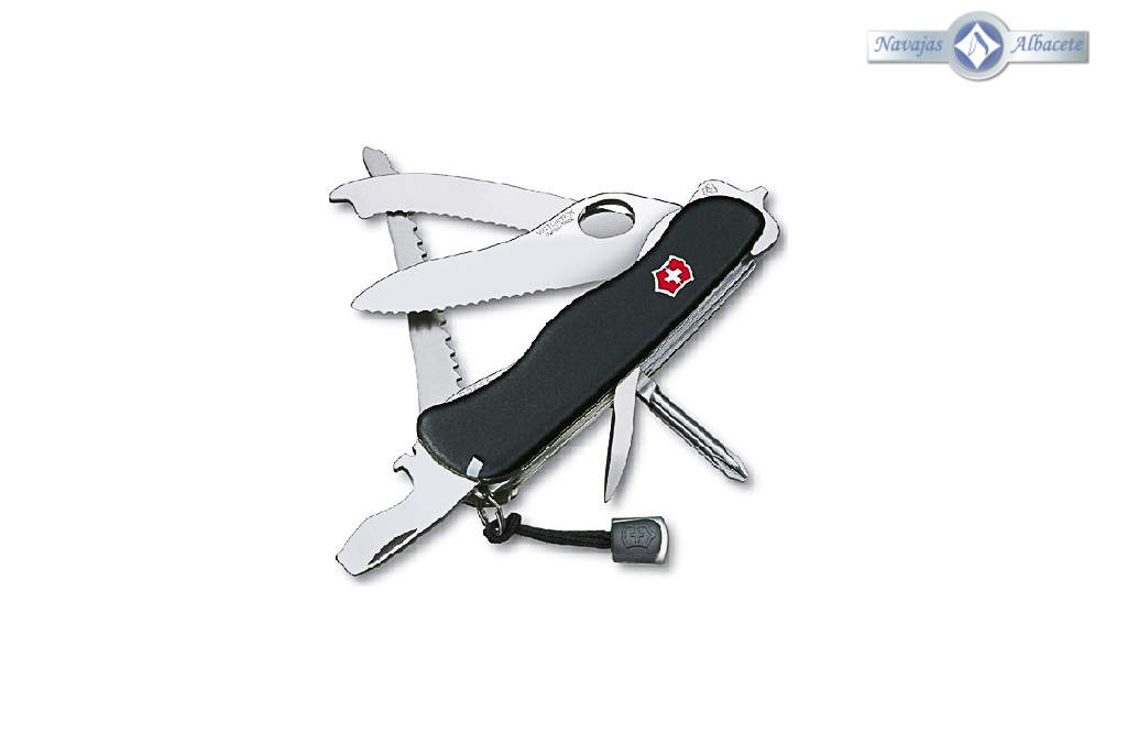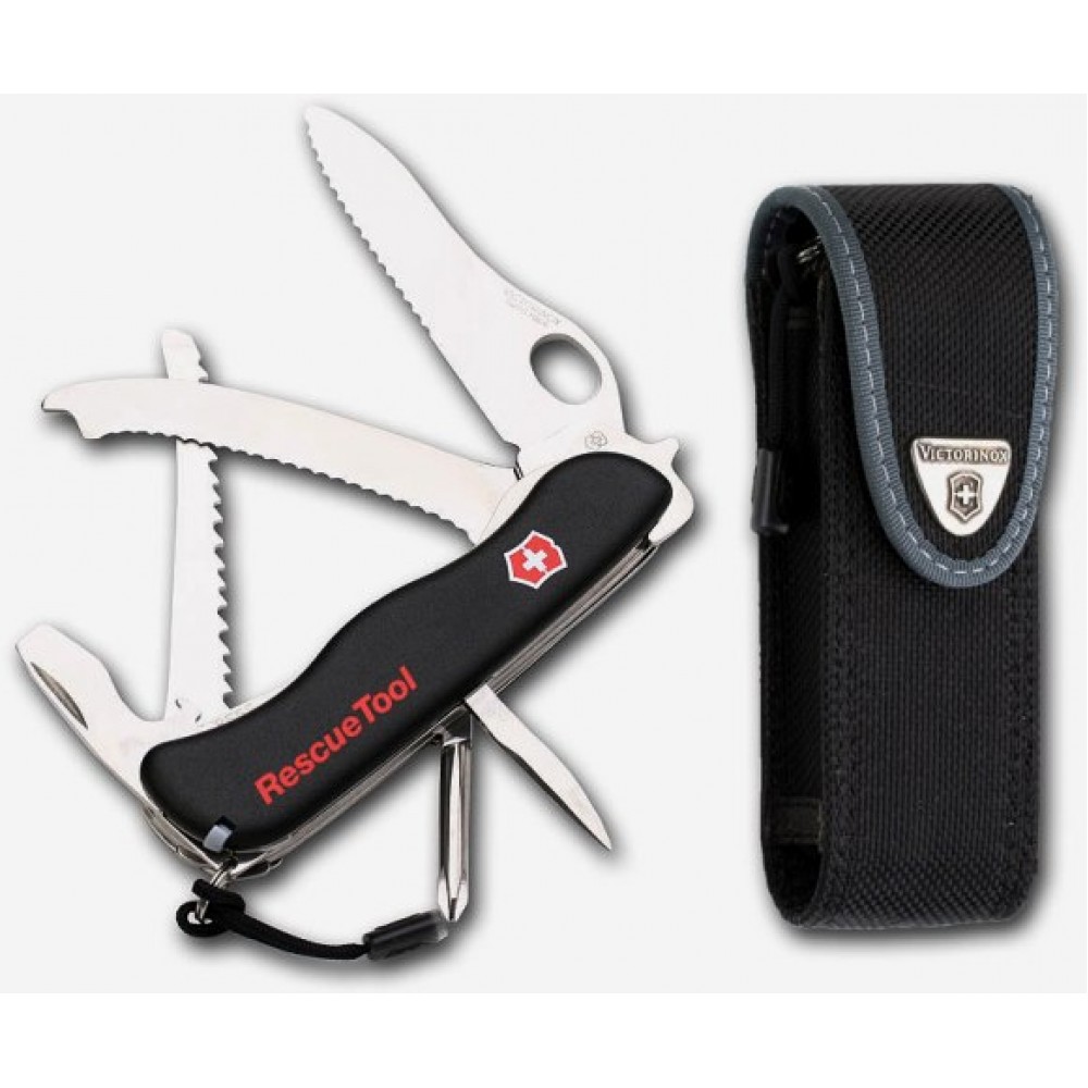 Descripción: Navaja de rescate «Rescue Tool» con 13 funciones y mango ergonómico para un excelente agarre, color negro. Hoja de acero inoxidable de 8,5 cm con bloqueo para una mano con 2/3 de filo dentado. Diseñada especialmente como herramienta de rescate. Herramientas: hoja grande, cortador de cinturones de seguridad, sierra para vidrio inastillable, punta rompe vidrio, punzón escariador, pinzas, palillo de dientes, destornillador Phillips 1/2, destornillador 7 mm, abrelatas, pelacables, anilla, acollador. Incluye funda de nylon resistente color negro con presilla para cinturón.