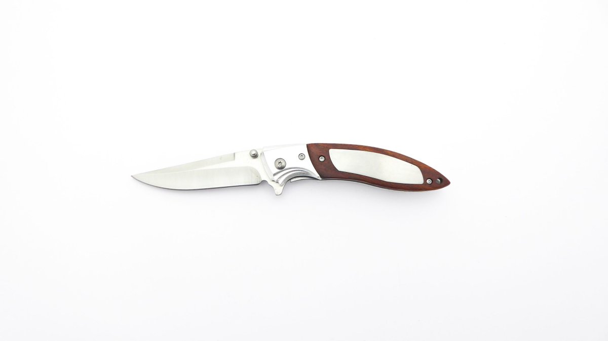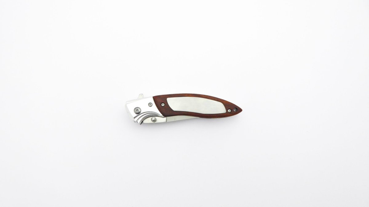 Descripción: «Scout» Navaja con mango de madera y aluminio, con virola de aluminio. Hoja de acero inoxidable molibdeno vanadio acabado satinado. Clip porta cinturón, bloqueo de seguridad Liner lock.