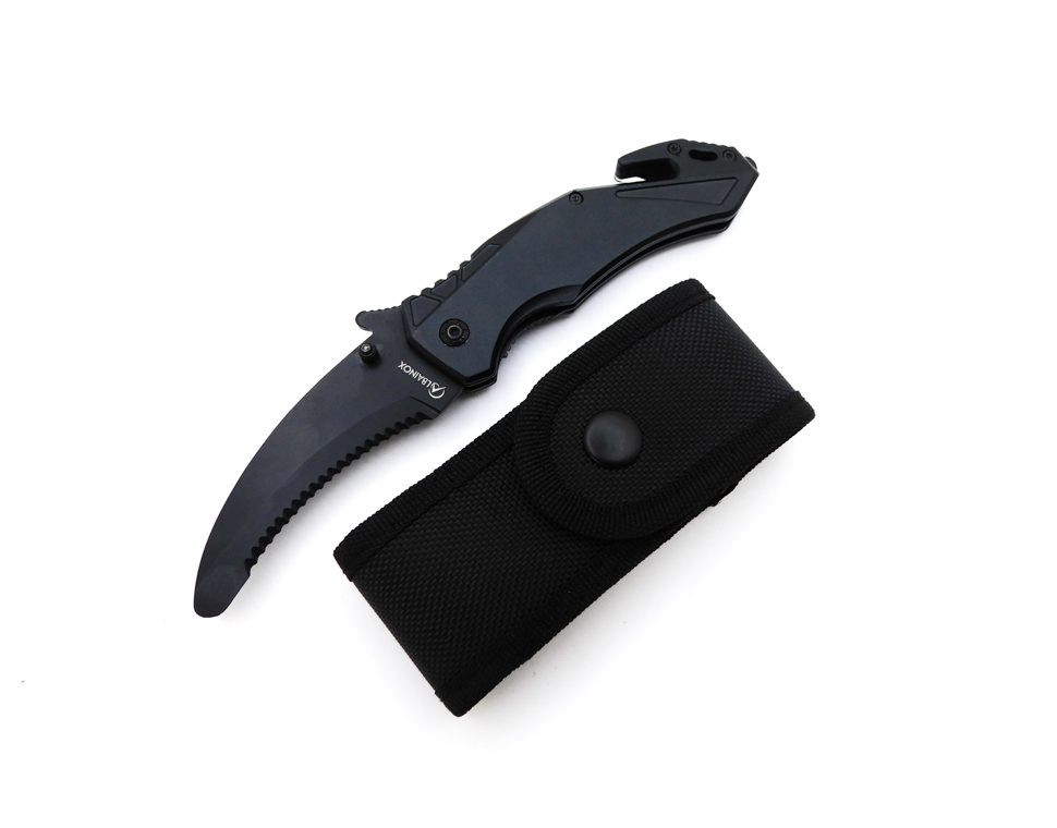 Descripción: Navaja táctica con mango de aluminio negro. Hoja de acero inoxidable molibdeno vanadio color negro, pico loro con punta redondeada, filo dentado. Punta rompecristales, cúter corta cinturón de una cuchilla, clip porta cinturón, bloqueo de seguridad Liner lock. Incluye funda de nailon semirrígida color negro con clip de seguridad de apertura rápida y trabilla para cinturón. Diseñada en España.