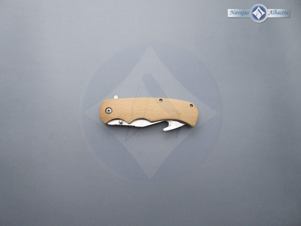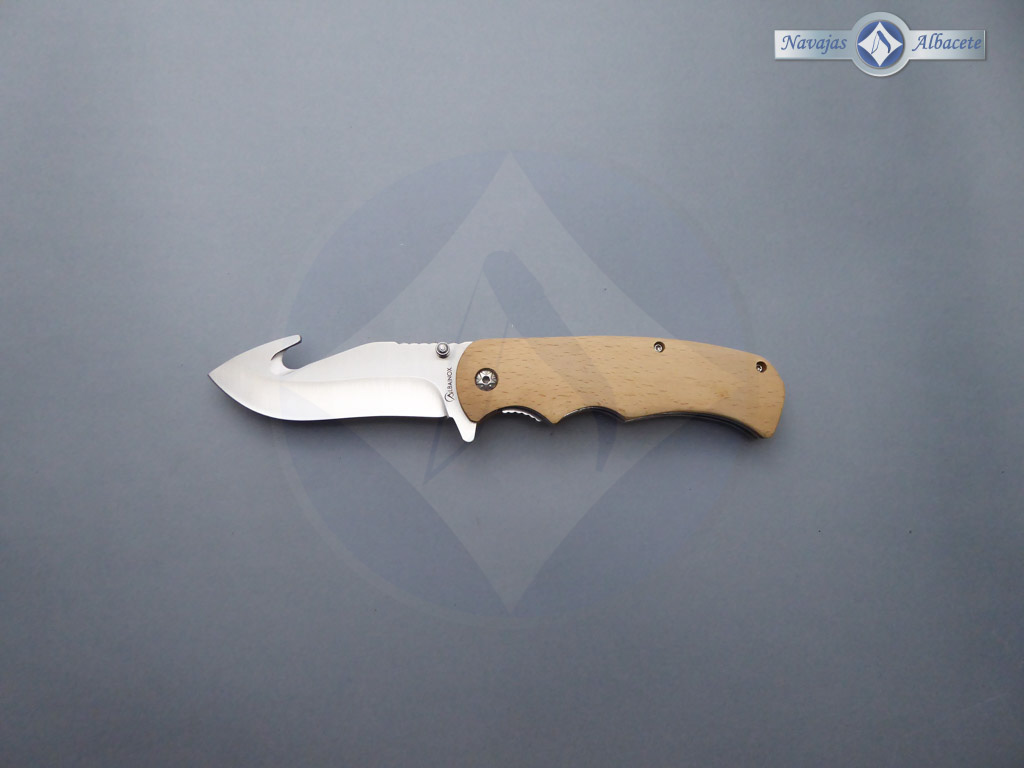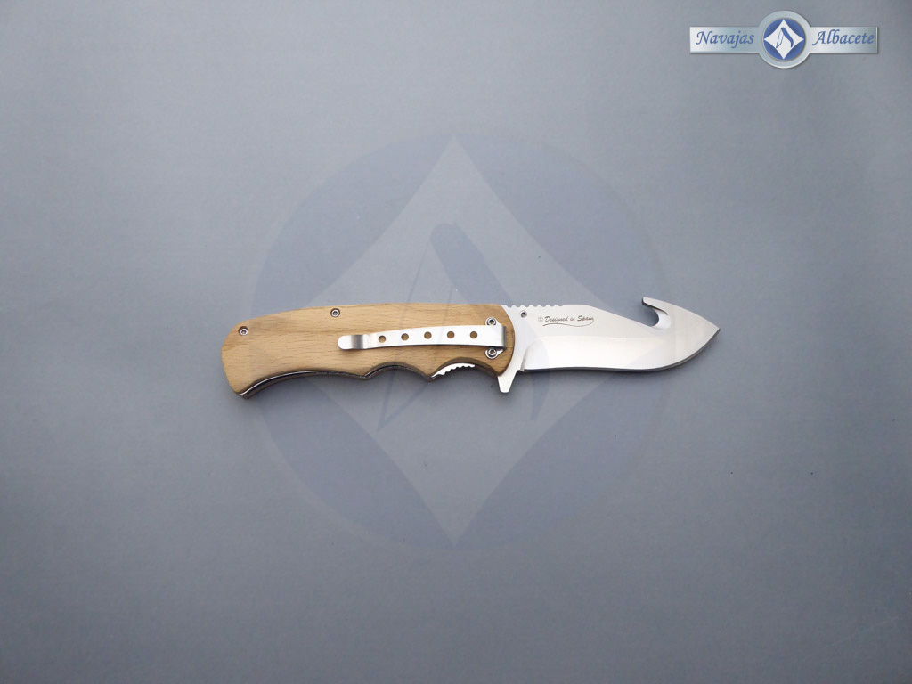 Descripción: Navaja de caza con mango de madera natural. Hoja de acero inoxidable molibdeno vanadio con skinner. Bloqueo de seguridad Liner lock. Incluye clip trasero para cinturón. Diseñada en España.