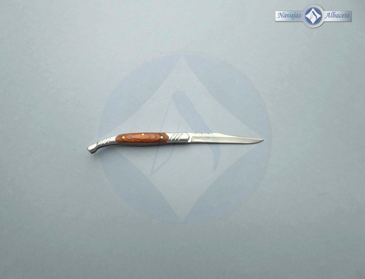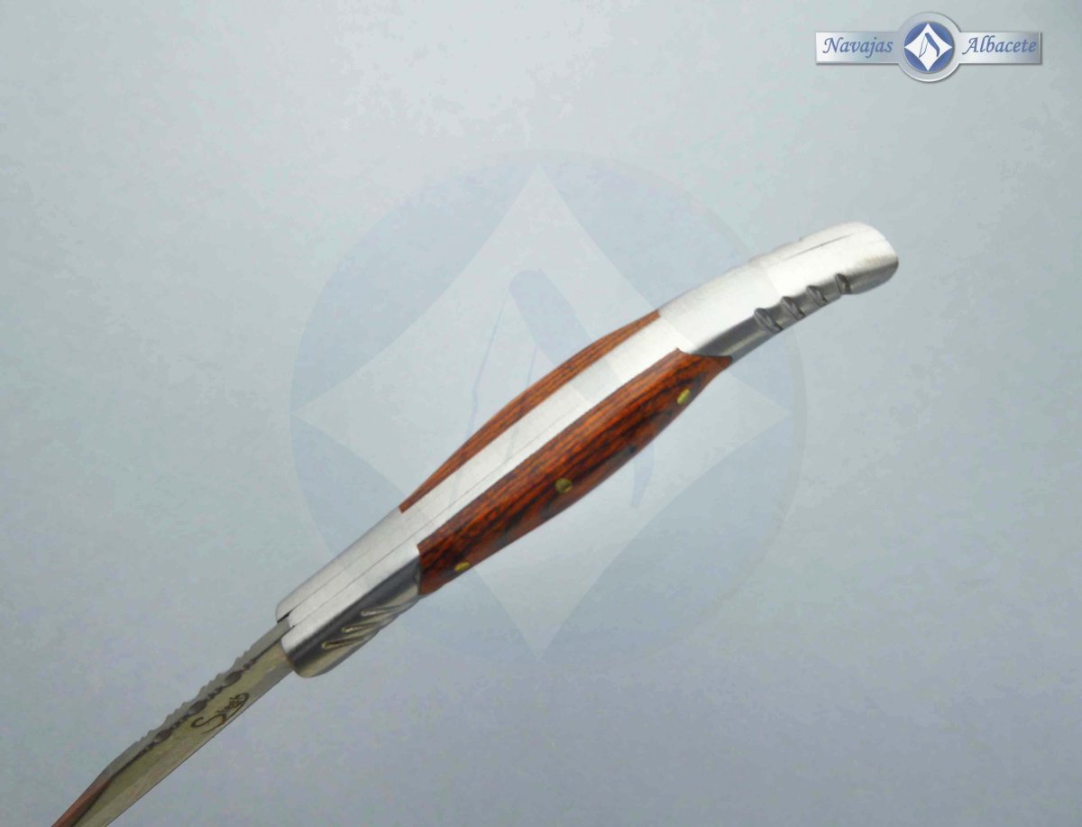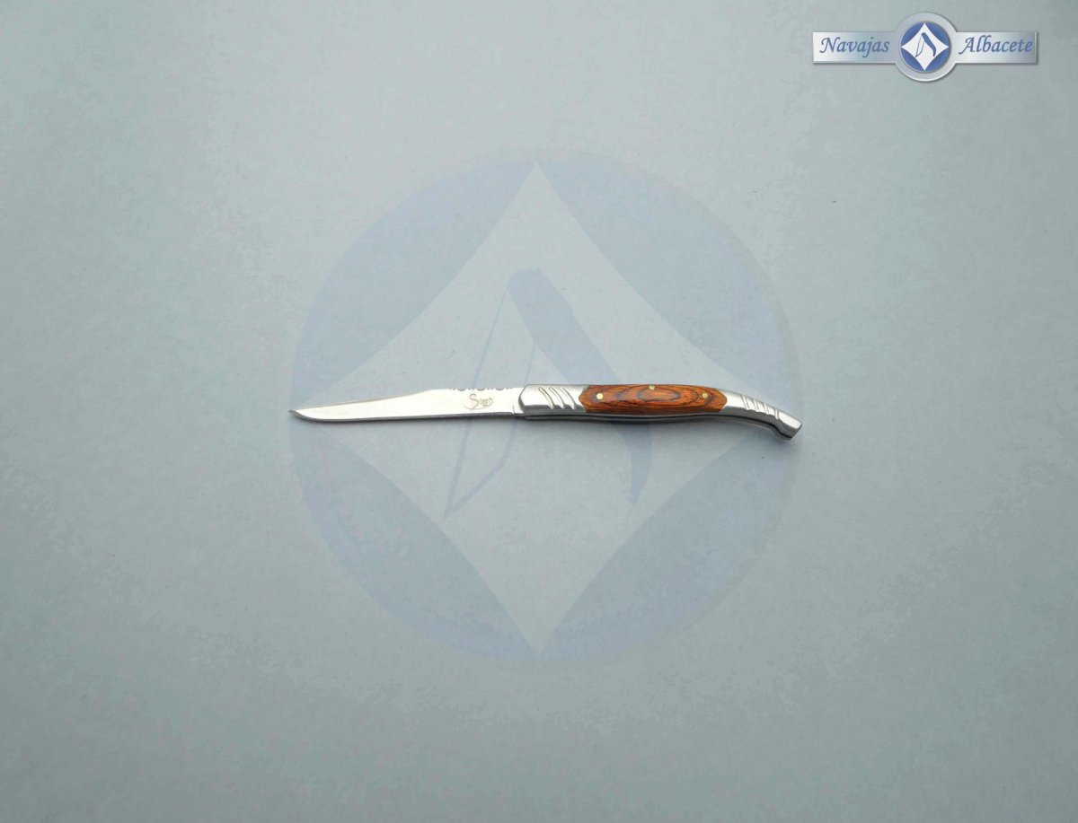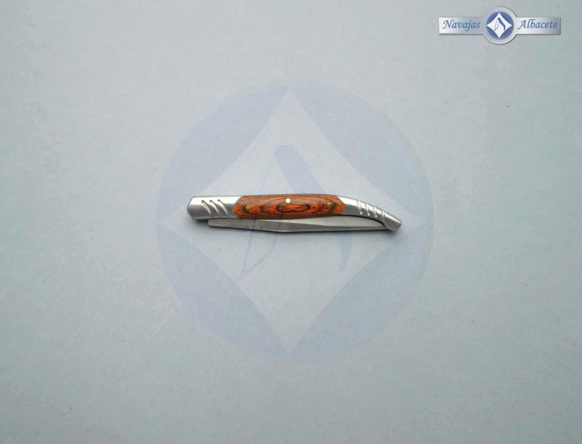 Descripción: Navaja estilete Steel 440, tamaño bolsillo, con mango de madera stamina, virola y rebajo en acero. Hoja de acero inoxidable molibdeno vanadio de 5 cm, acabado satinado. Bloqueo de pistón. Diseñada en España.