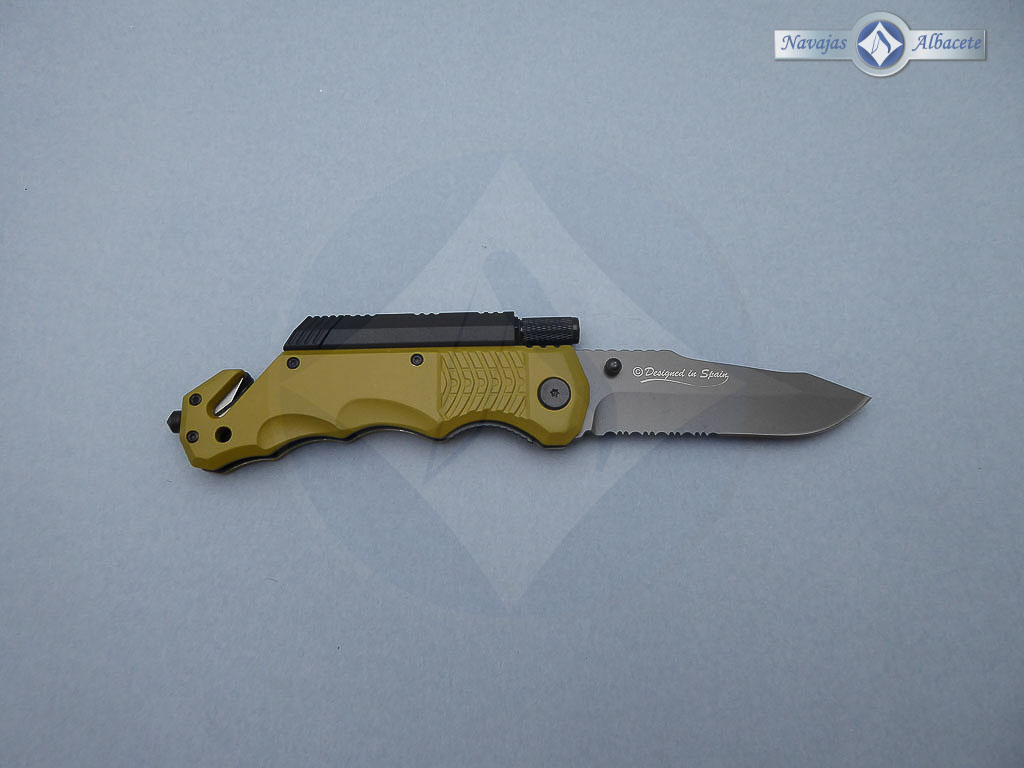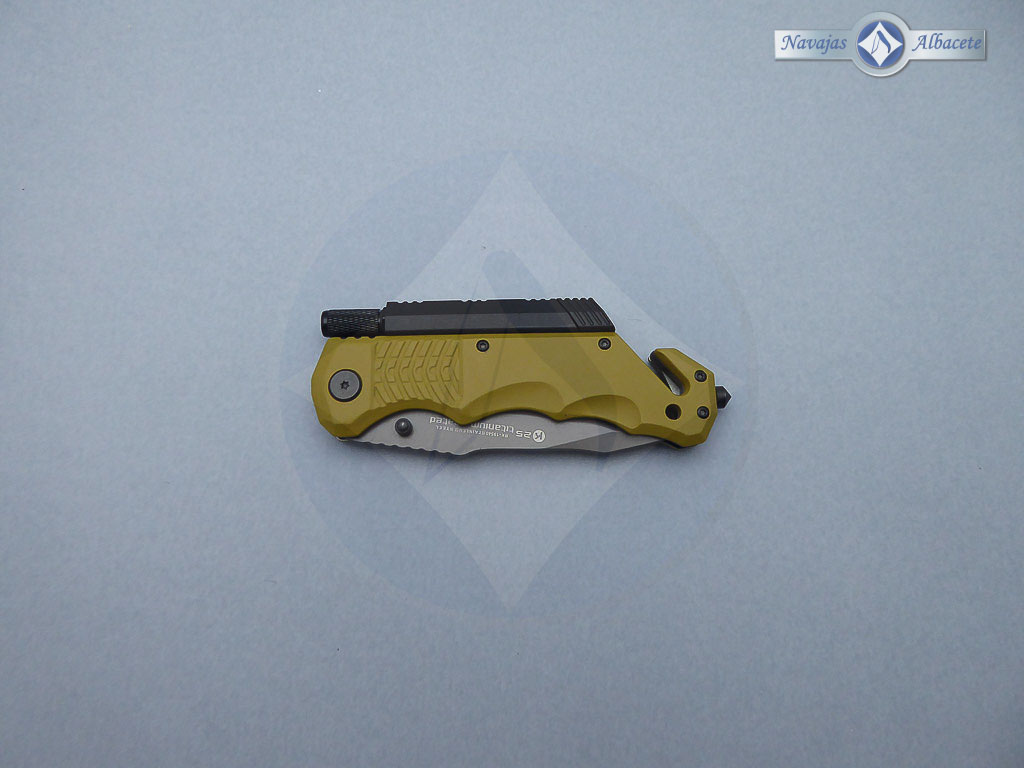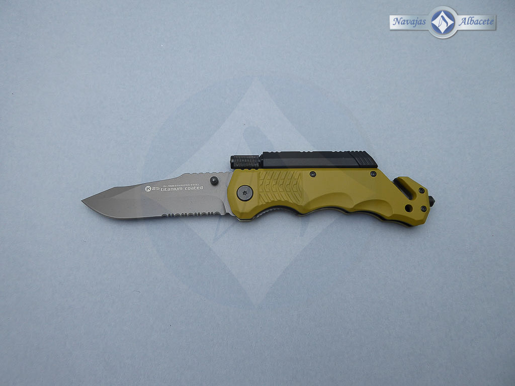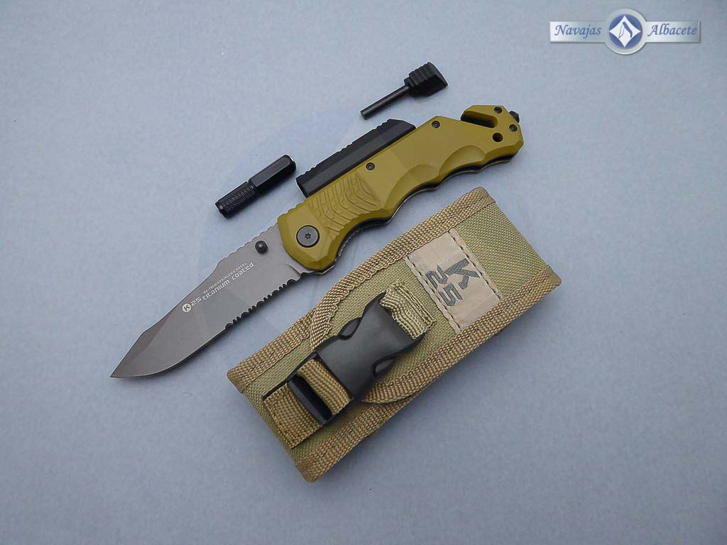 Descripción: Navaja táctica k25 con mango de aluminio engomado antideslizante, color coyote. Hoja de acero inoxidable recubierta de titanio, con sierra parcial en el filo, color gris. Bloqueo de seguridad Liner lock. Punta rompe vidrio, cúter corta cinturón de doble cuchilla. Incluye pedernal, linterna imantada y funda de nylon K25 con velcro, broche y sistema molle, ofreciendo un sistema óptimo de enganches. Peso con funda 214 gramos. Incluye caja estuche magnético color negro. Diseñada en España.