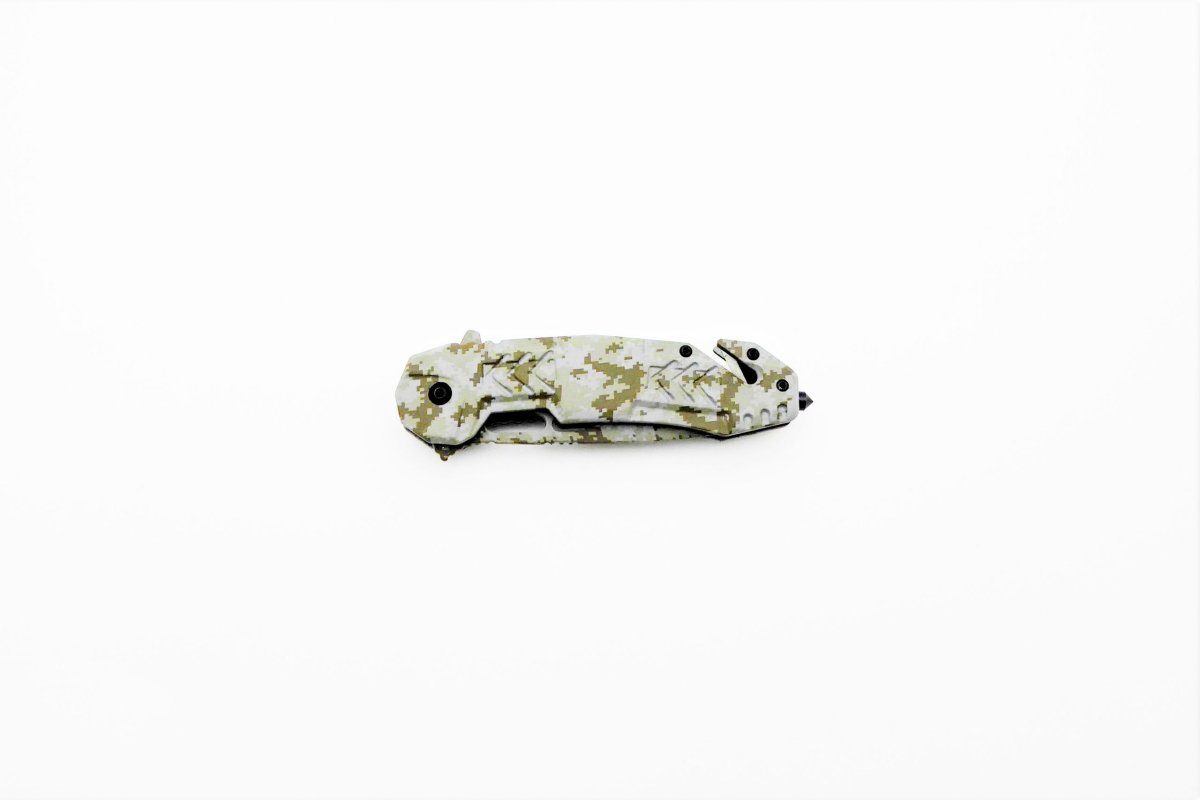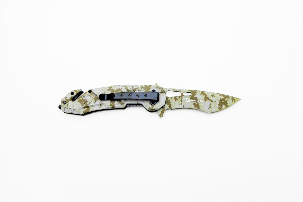 Descripción: Navaja táctica con mango en aluminio efecto camuflaje árido. Hoja en acero molibdeno vanadio calada con efecto árido. Punta rompe cristales, clip porta cinturón, bloqueo de seguridad linear lock y cúter corta cinturón de una cuchilla.