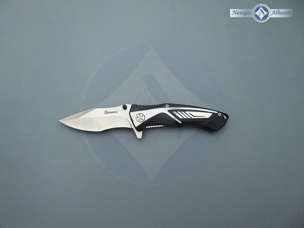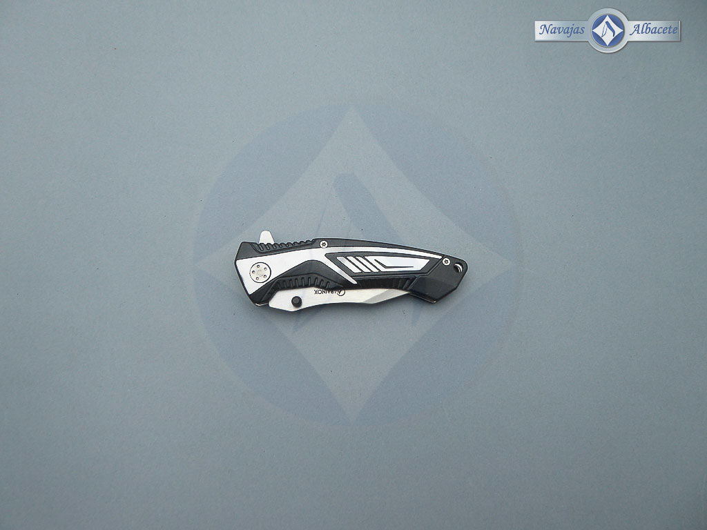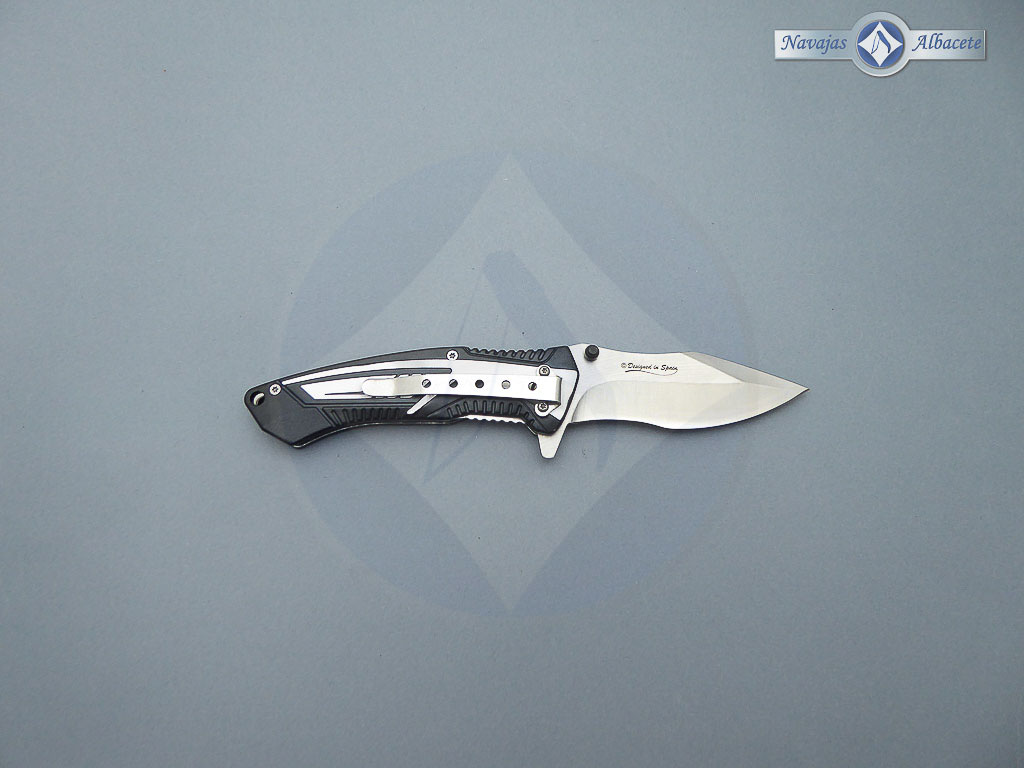 Descripción: Navaja táctica con mango de aluminio, acabado negro y aluminio. Ojal en el pomo. Hoja de acero inoxidable acabado satinado. Clip portacinturón, sistema de bloqueo Liner lock. Diseñada en España.