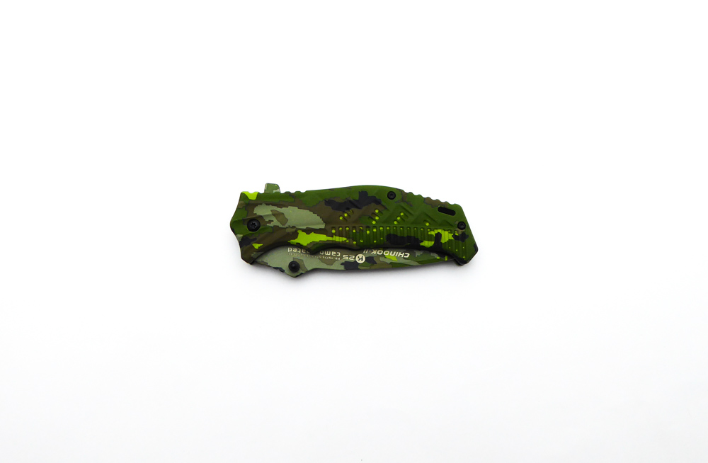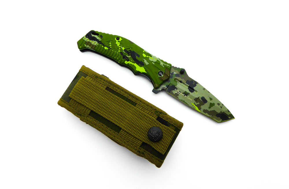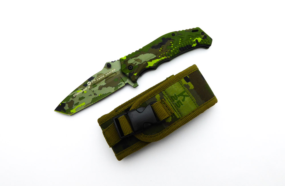 Descripción: Navaja táctica K25 «Chinook-II» con mango de aluminio verde camuflaje. Hoja de acero inoxidable acabado camuflaje recubierto de titanio. Bloqueo de seguridad Liner lock. Incluye funda de nylon a juego con velcro interior, clip adaptable de seguridad y sistema molle (sistema óptimo de enganches). Diseñada en España.