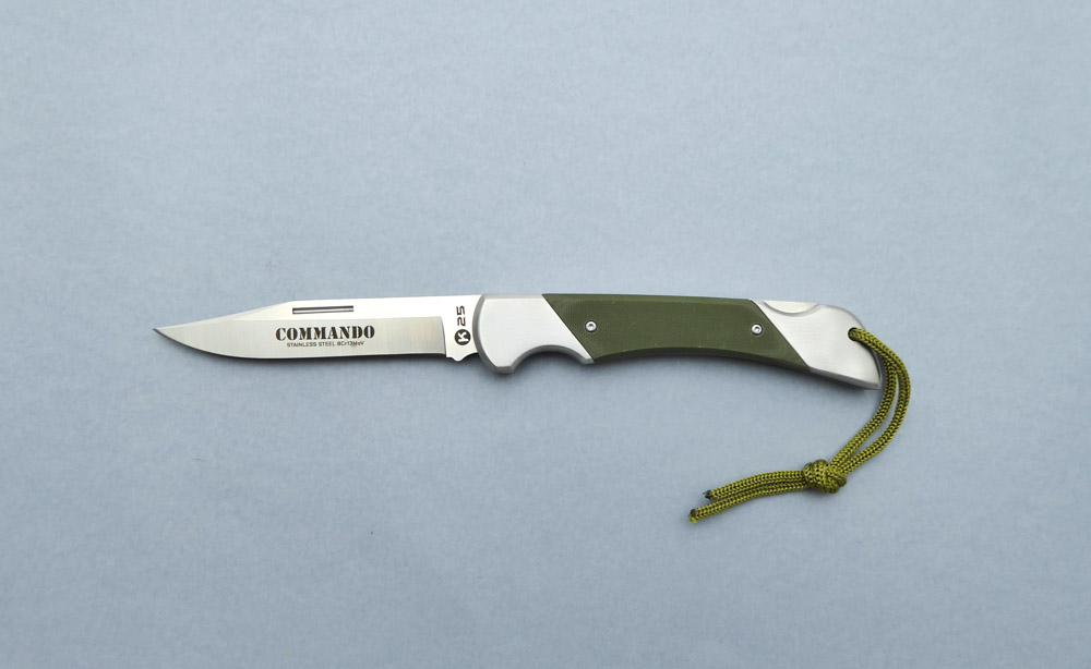 Descripción: Navaja táctica K25 «Commando» con mango en G10 color verde, virola y rebajo en acero. Hoja de acero inoxidable molibdeno vanadio cromo con acabado CNC. Bloqueo de seguridad Back lock. Incluye cordón verde y funda de terciopelo negro.