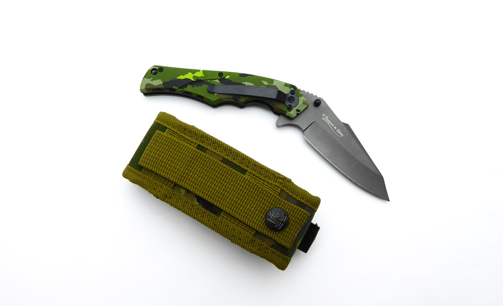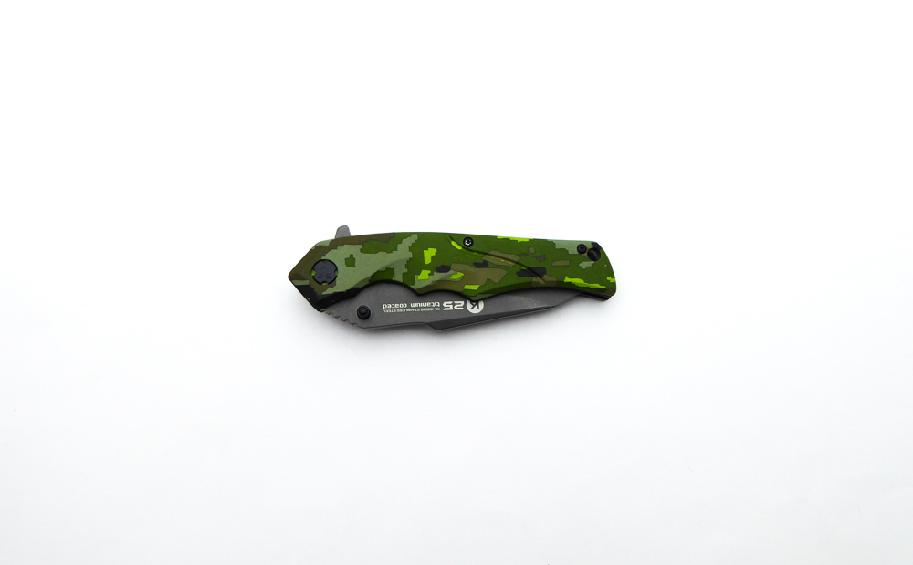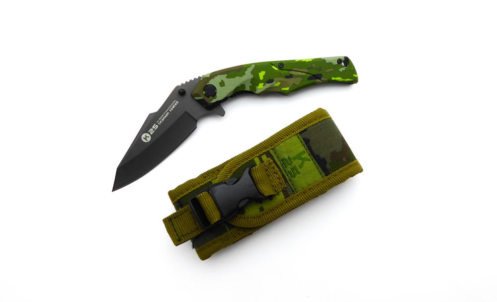 Descripción: Navaja táctica K25 con mango ergonómico de aluminio color verde camuflaje. Hoja de acero inoxidable molibdeno vanadio con recubrimiento de titanio. Clip porta cinturón. Bloqueo de seguridad Liner lock. Incluye funda de nylon en color verde camuflaje con velcro, clip de seguridad y sistema molle, ofreciendo un sistema óptimo de enganches. Diseñada en España.