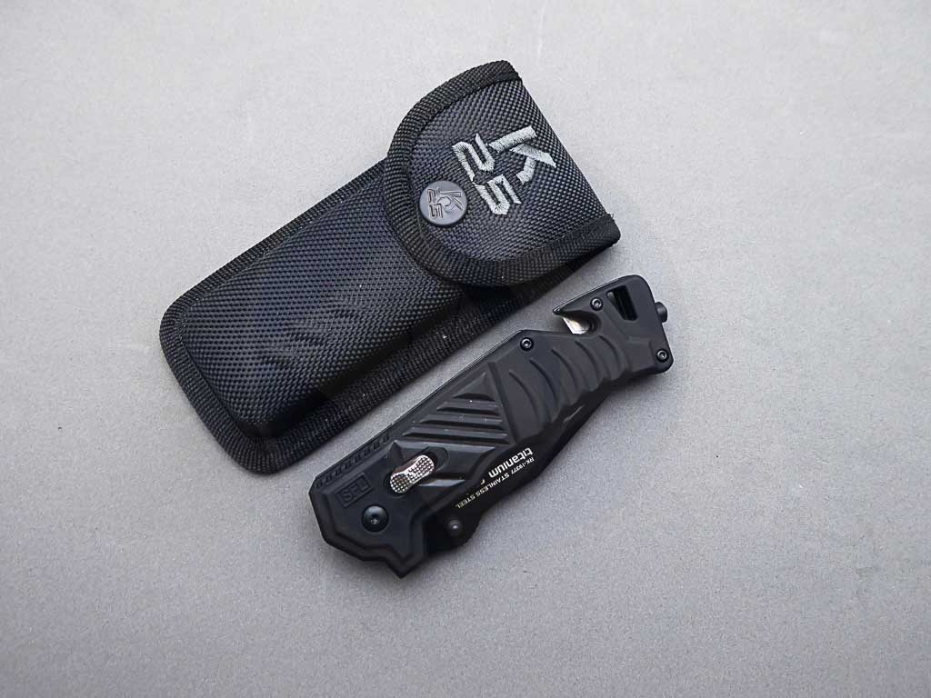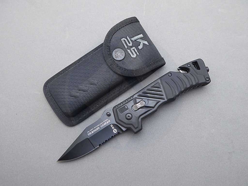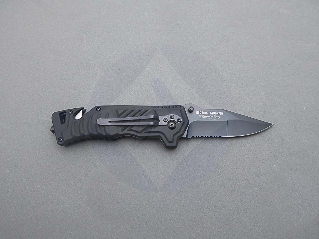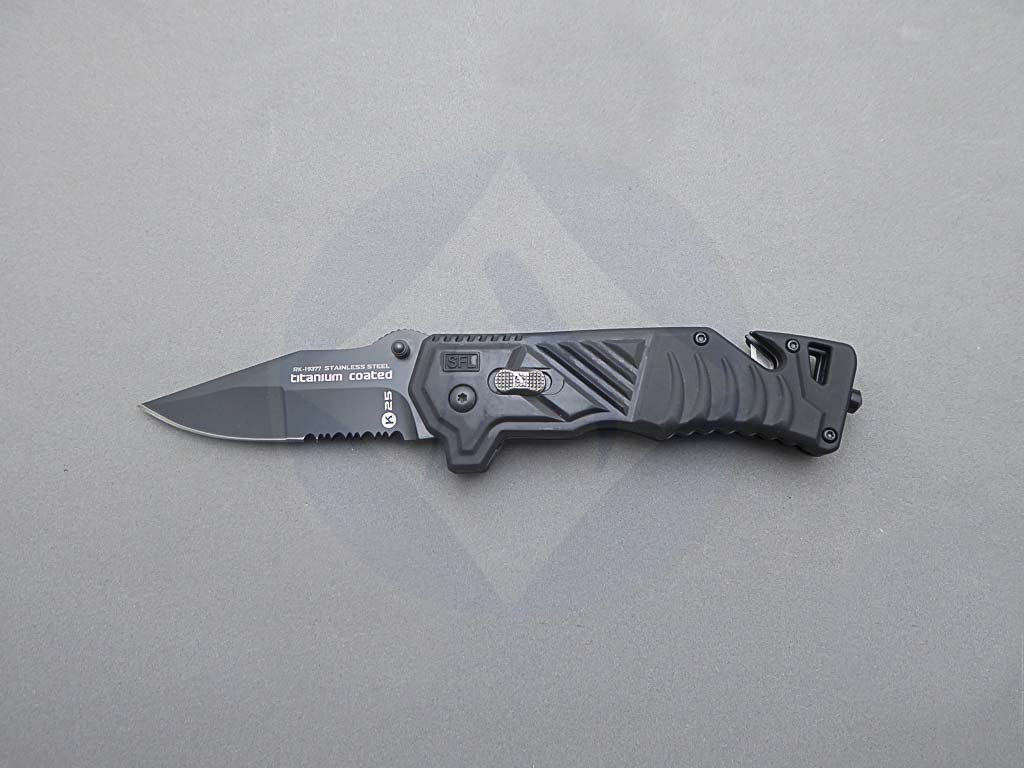 Descripción: Navaja táctica K25 con mango de fibra sintética recubierto de goma, ofreciendo un agarre firme y seguro. Hoja de acero inoxidable molibdeno vanadio recubierta de titanio con sierra parcial en el filo. Bloqueo de seguridad. Punta rompe vidrio tungsteno, cúter corta cinturón de seguridad, y clip trasero. Incluye funda de nylon negra con clip de seguridad y sistema molle. Diseñada en España.