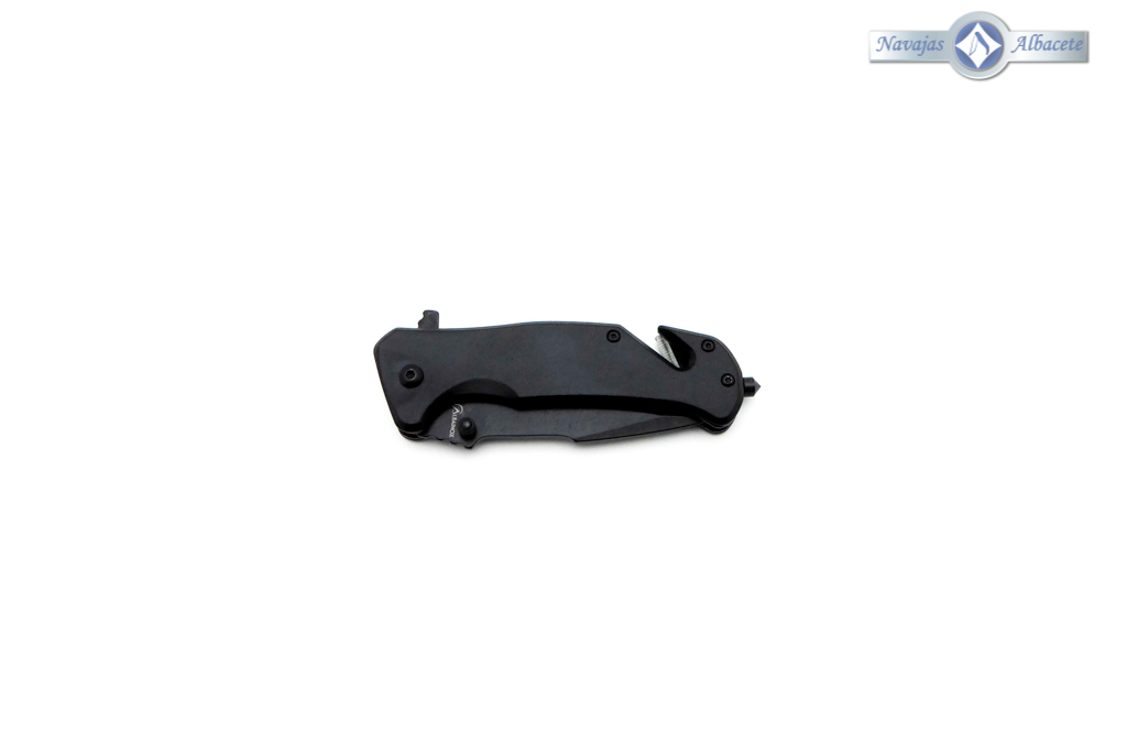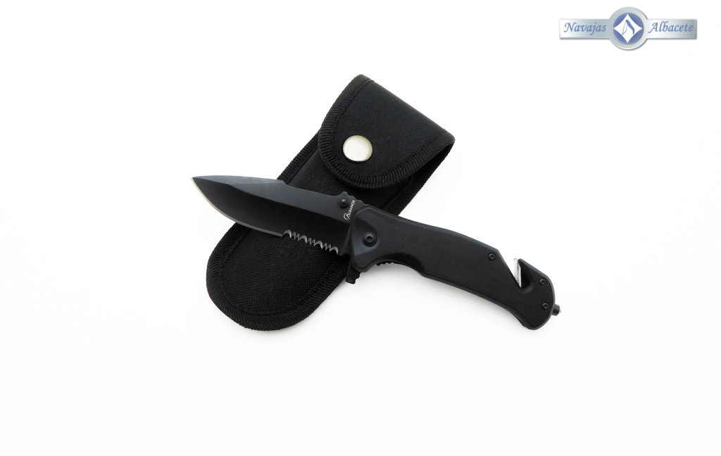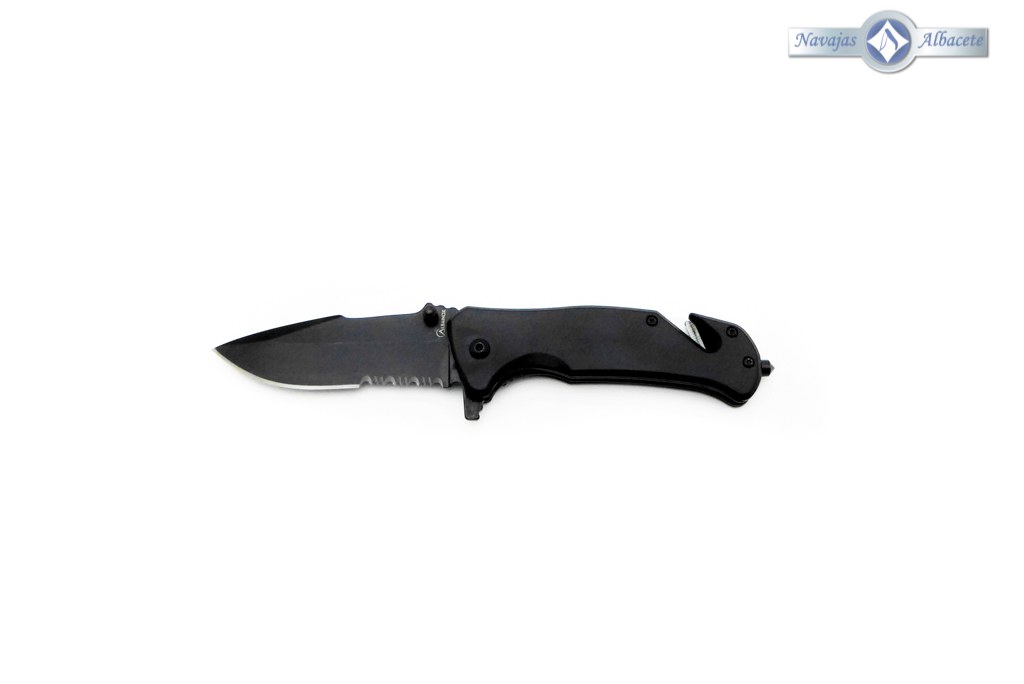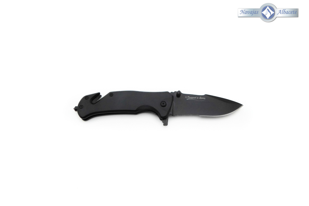 Descripción: Navaja táctica de seguridad con mango de aluminio color negro. Hoja de acero molibdeno vanadio acabado negro, con sierra. Punta rompe cristales, bloqueo de seguridad Liner lock y cúter corta cinturón de una cuchilla. Diseñada en España. Incluye funda de nailon negra con trabilla para cinturón.