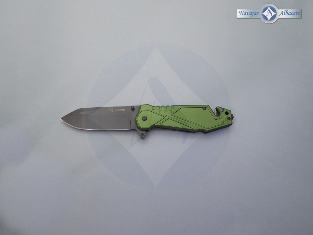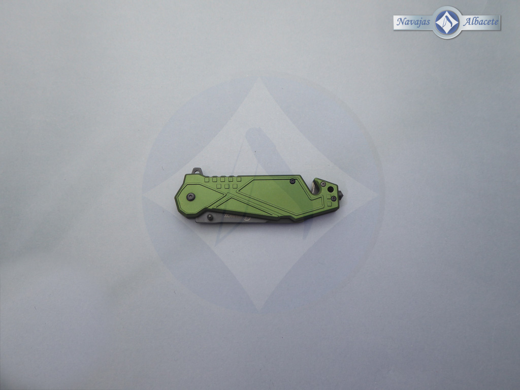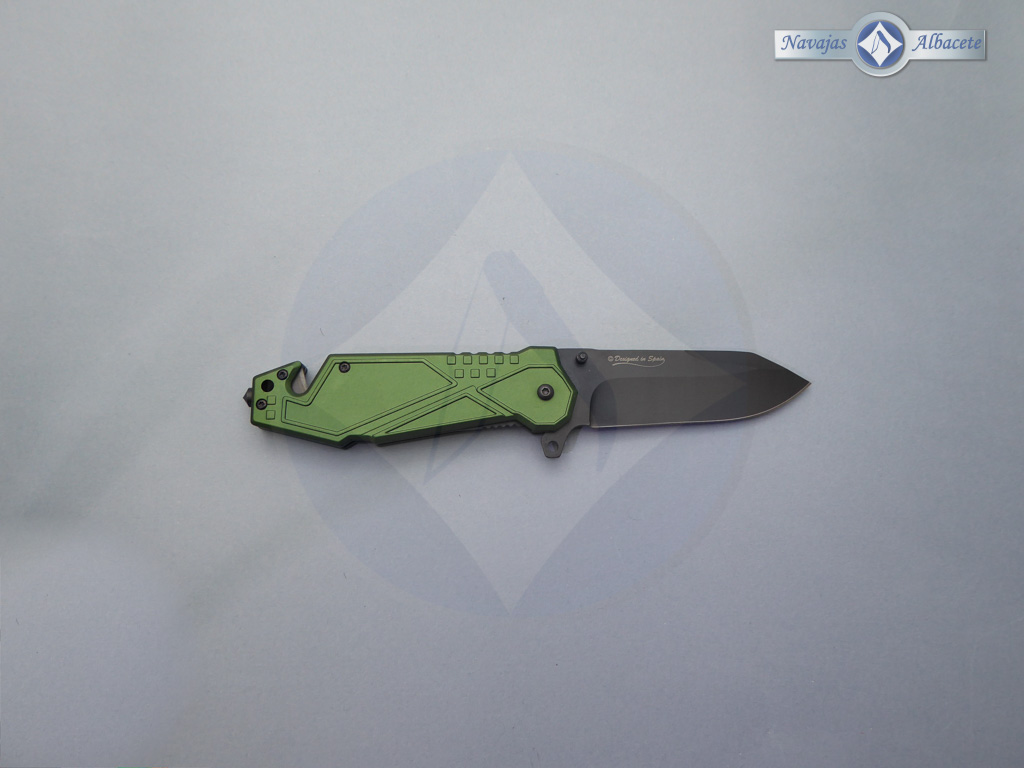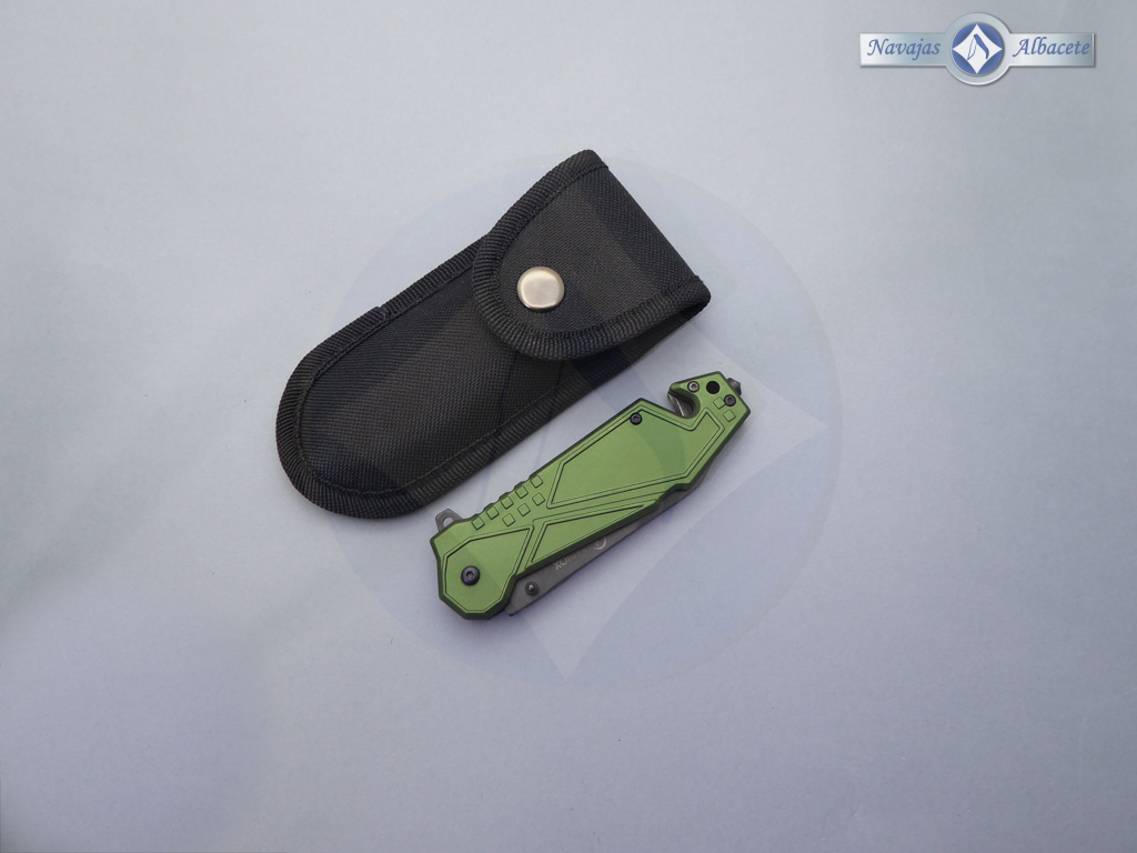 Descripción: Navaja táctica de seguridad con mango en aluminio color verde. Hoja en acero molibdeno vanadio con acabado negro. Punta rompevidrio, bloqueo de seguridad liner lock y cúter corta cinturón de una cuchilla. Diseñada en España. Incluye funda de nylon color negro con trabilla para cinturón y clip de seguridad de apertura rápida.