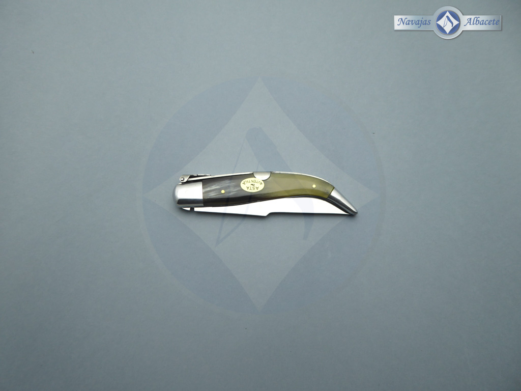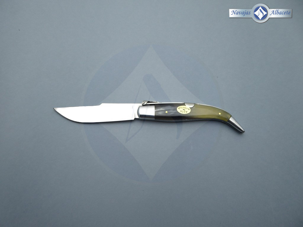 Descripción: Navaja clásica Teja con mango en asta de toro, virola y rebajo en aluminio. Hoja de acero inoxidable molibdeno vanadio cromado. El muelle es de acero con palanquilla.