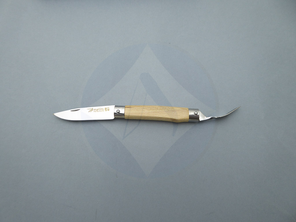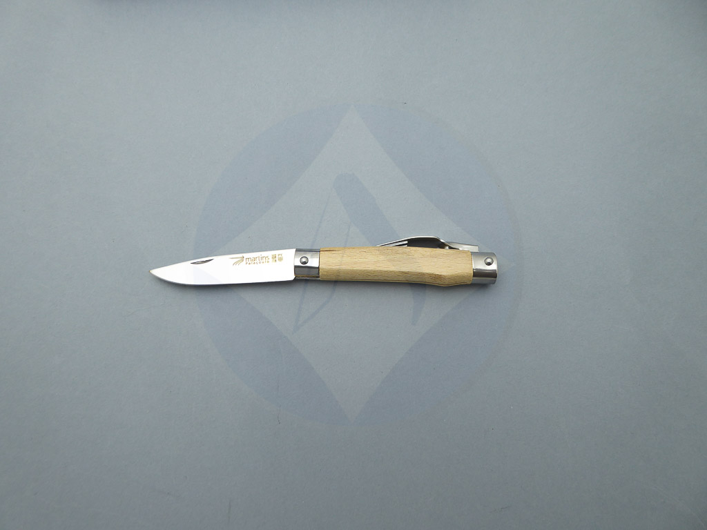 Descripción: Navaja tenedor Martins con mango de madera y virola de acero. Hoja de acero inoxidable molibdeno vanadio. Cierre de pistón. Incluye tenedor. Las navajas Martins son fabricadas en Portugal y son reconocidas por su alta calidad y durabilidad.