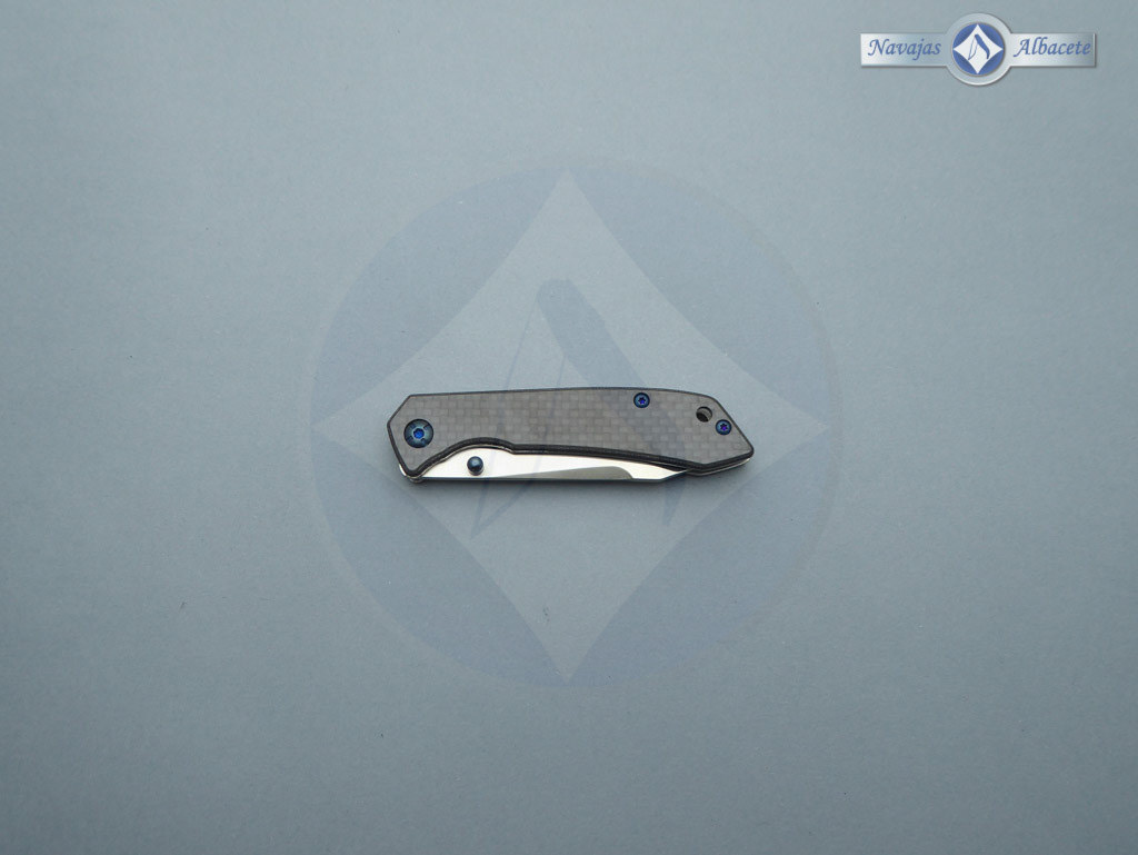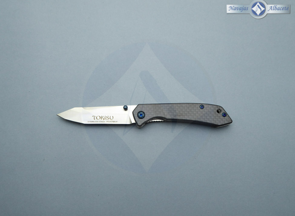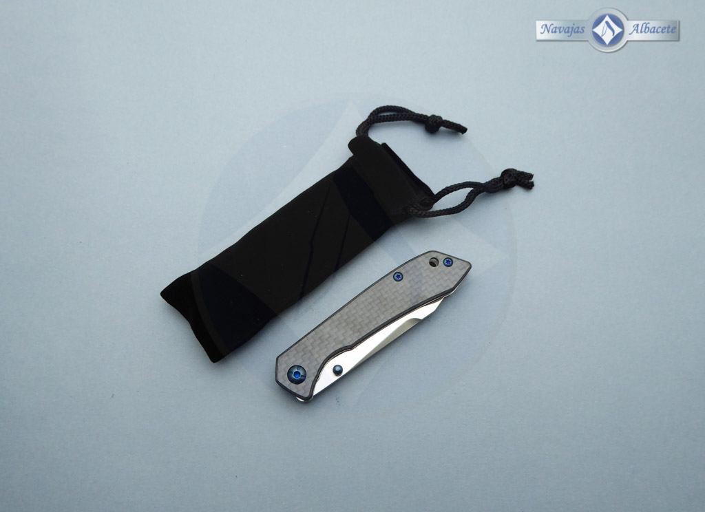Descripción: Navaja táctica Tokisu con mango de G10 y fibra de carbono, tamaño bolsillo. Hoja de acero inoxidable con acabado CNC satinado. Apertura mediante rodamientos. Bloqueo Liner lock. Diseñada en España. Incluye caja imantada y funda de terciopelo negro.